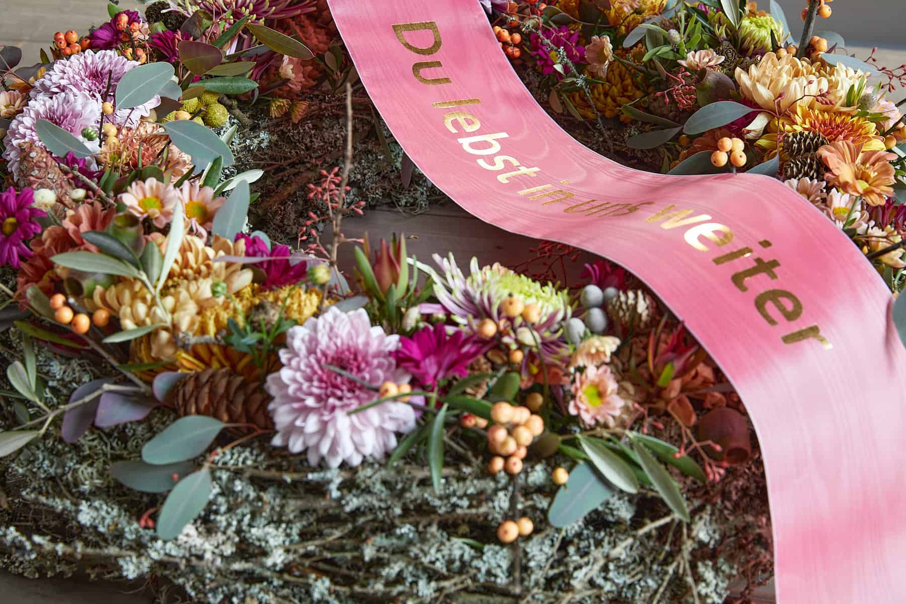 Ein Kranz, der mit den Abschiedsworten „Du lebst in uns weiter“ mit schlichten Goldbuchstaben auf dem Moiré-Kranzband aufgedruckt, voller Hoffnung steckt. Der obere Teil symbolisiert das Leben mit allerlei Blüten und Früchten farblich sensibel und ansprechend ausgeschmückt. Der untere Teil dazu konstratierend eher das Endliche verdeutlichend, farbreduziert und rau mit Flechten- und Lärchenzweigen gestaltet.
