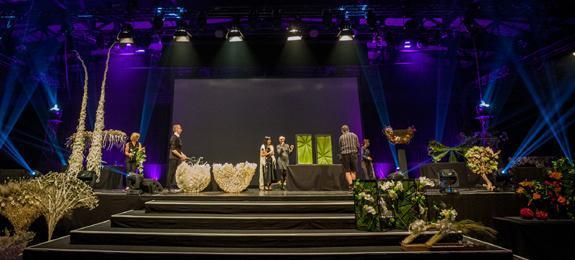 Bild rechts: Die vielfältigen und selbst in der großen Halle der Arena weithin wirksamen Showfloristiken von Elly Lin und Stein Are Hansen füllten schließlich die Bühne, bevor die Halbfinalisten des Worldcups vorgestellt wurden.