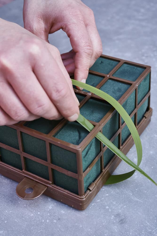 Zunächst wird der Steckschaum gewässert. Anschließend werden die Grannenlilienblätter in den Steckschaum eingesteckt, jeweils um die Steckbasis herumgeführt und die Enden ebenfalls eingesteckt. Seitlich werden dann die Blüten hinzugefügt und schließlich das bedruckte Trauerband angebracht. Fertig ist der wunderschöne Trauerschmuck.