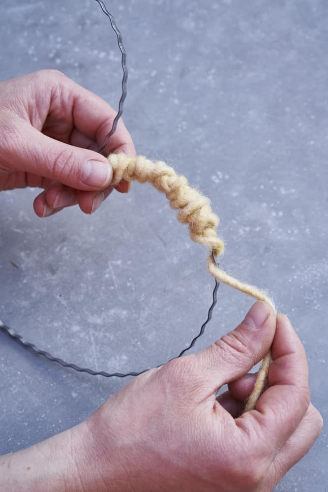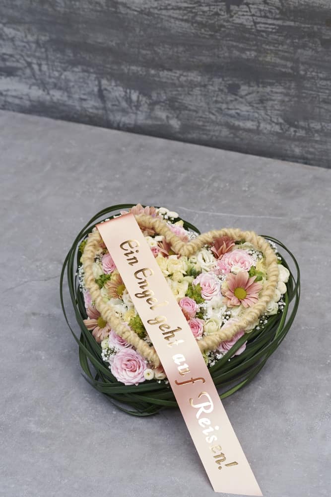 Zuerst wurde die herzförmige Steckschaum-Basis gewässert und die Ränder mit Schlangenbartblättern gestaltet. Im Anschluss wurden die Floralien auf der Oberseite eingesteckt und das Drahtherz mit grobem Woll-Garn umwickelt. Das Herz wurde dann mittels Steckdraht auf der Steckschaumbasis fixiert. Im letzten Schritt wird die Trauerschleife am Drahtherz befestigt – das hier eingesetzte Schleifenband wurde von 123 printing bedruckt. Hierfür sind verschiedene Schleifenbandqualitäten einsetzbar und auch die Prägung kann individuell, in Metallic-Tönen oder farbig bestimmt werden.