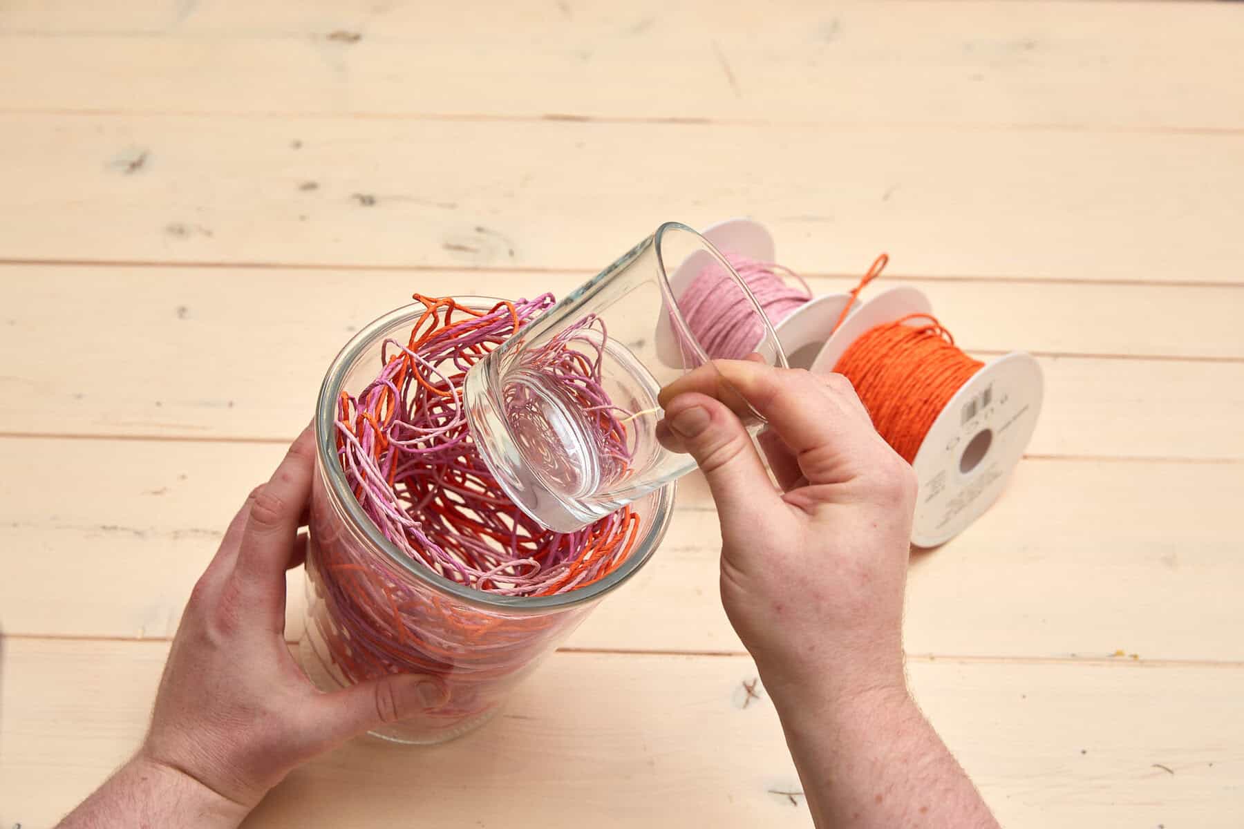 Zunächst den Draht großzügig von der Rolle abspulen und das entstandene Gewusel locker ins Glasgefäß einfügen. Nun wird das kleine Glasgefäß mittig ins große eingesetzt. Zum Schluss noch das Schleifenband drumherum festknoten, die Tulpen einpflanzen und das Etikett anbringen.