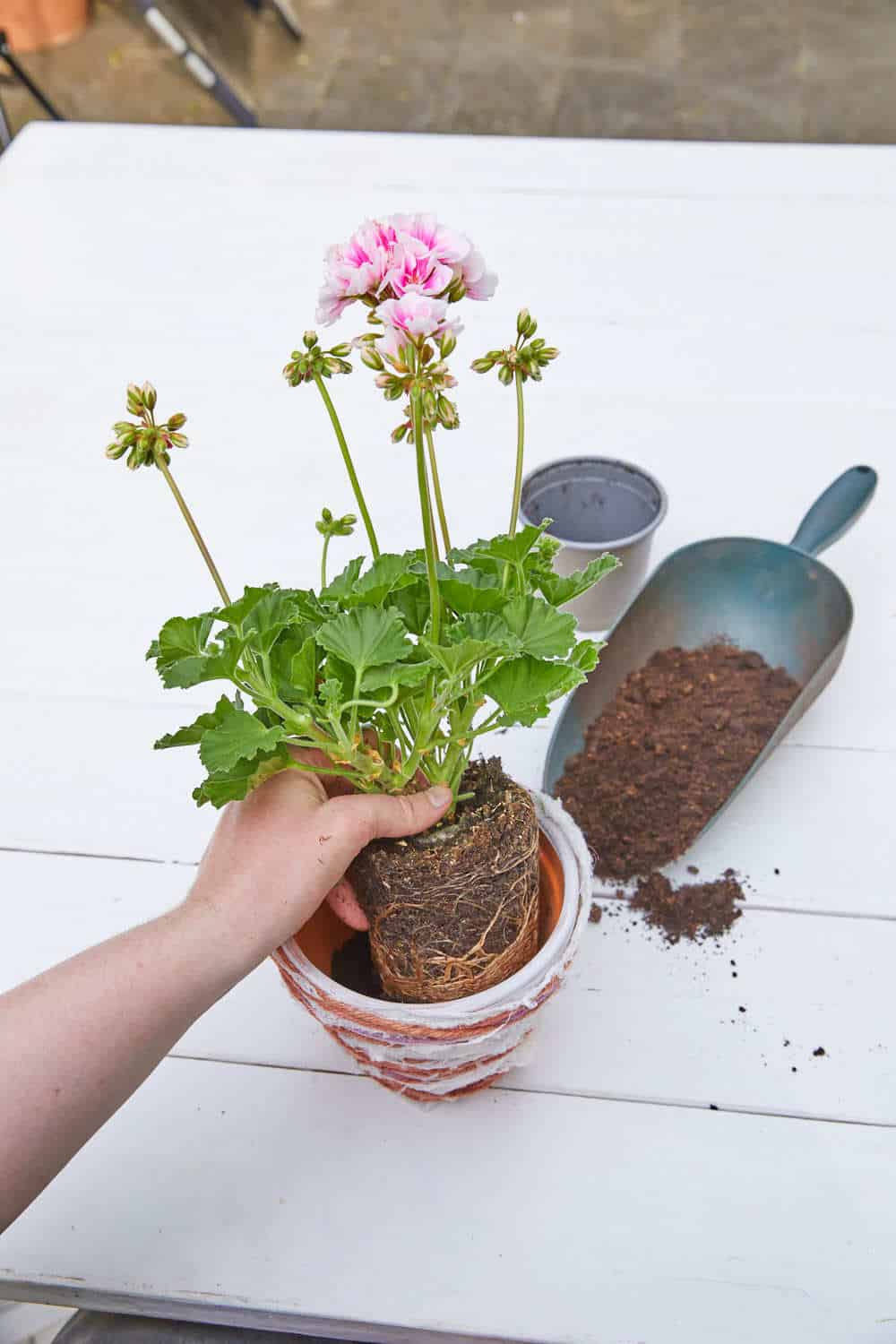 - Zuletzt den Tontopf mit der Pelargonie bepflanzen.