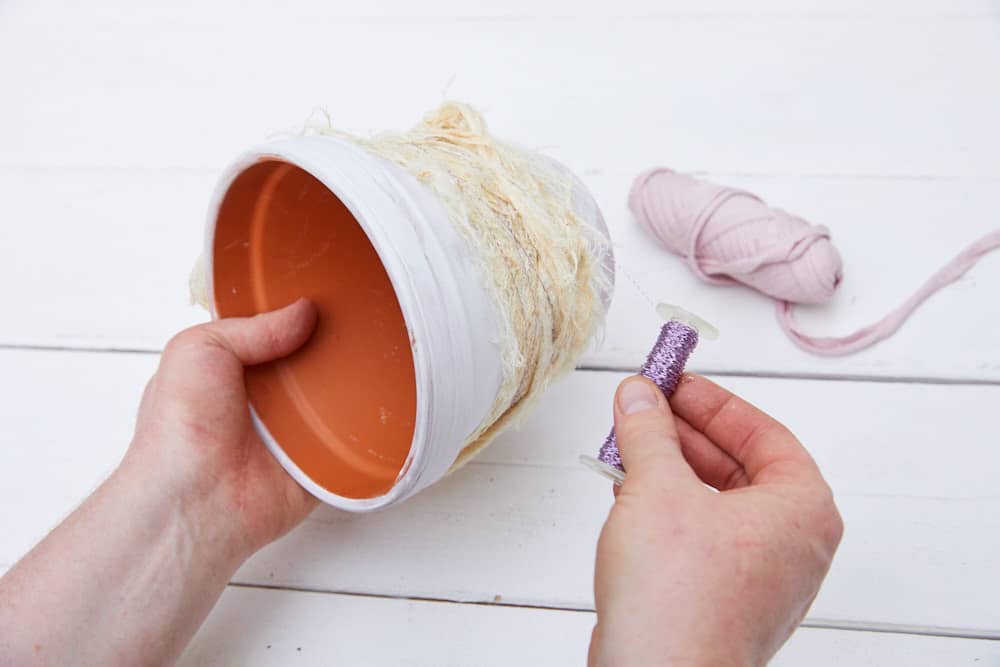 - Einen Tontopf mit weißer Farbe kolorieren und trocknen lassen.