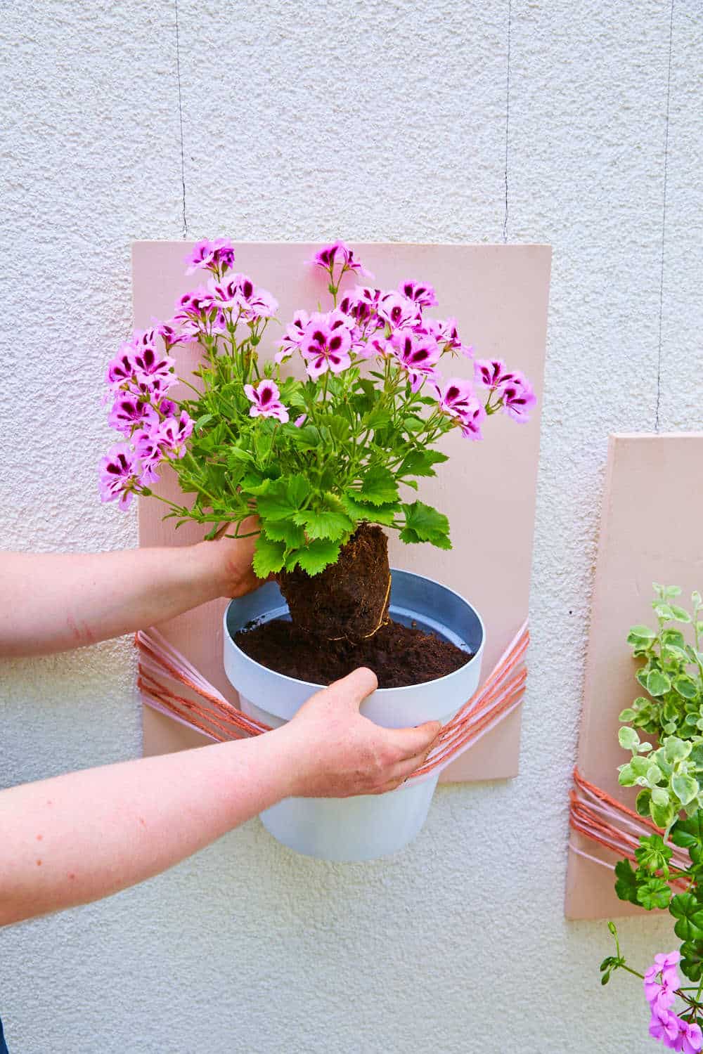 Besonders beliebt sind die Pelargonien bei euren Kunden als Balkonbepflanzung. Deshalb präsentieren wir euch hier eine kreative Variante in Form von blühenden Wandbildern.