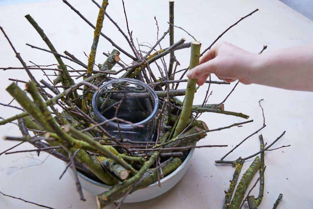 • Äste in gewünschte Länge schneiden. Das wassergefüllte Glas in die Schale stellen und den Zwischenraum mit Ästen durch senkrechtes Einstecken auffüllen.