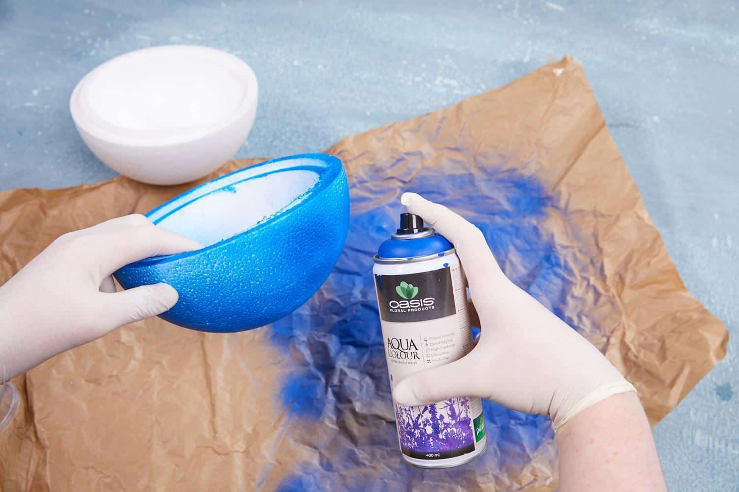 1. Die Polystyrolkugel halbieren und mit Farbspray kolorieren. Danach trocknen lassen.