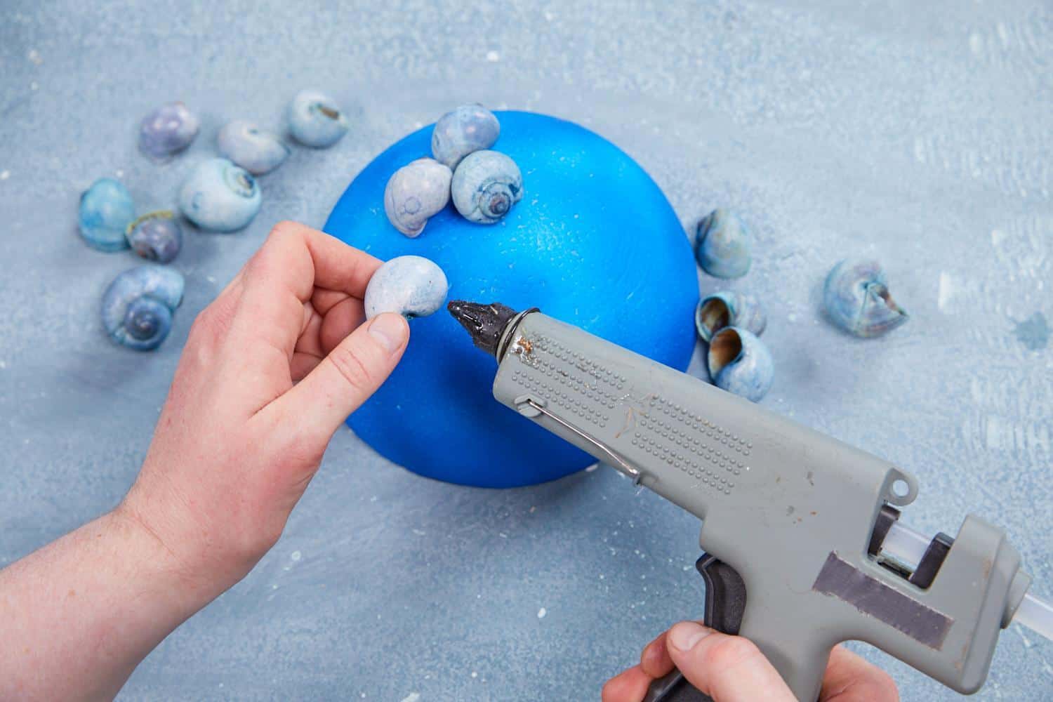2. Die gefärbten Schneckengehäuse mittels Heißkleber aufkleben.