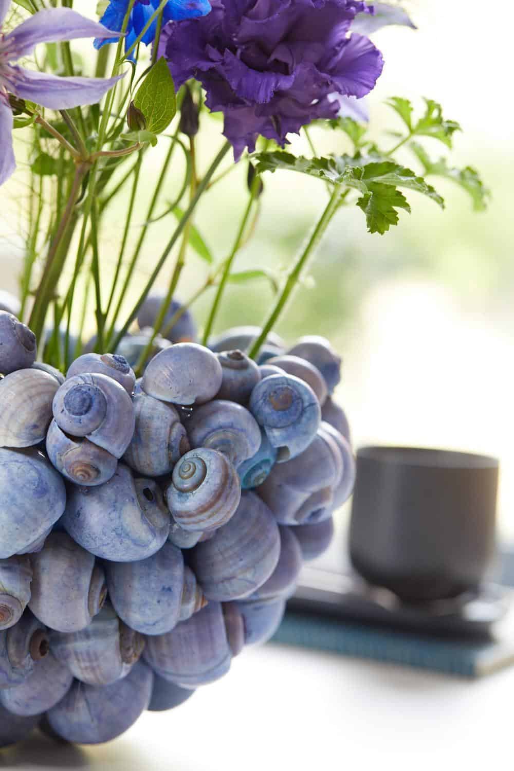Dieses Werkstück ist ein großartiger Eyecatcher. Denn auch wenn die Floralien wunderschön aussehen, steht das selbstgemachte Gefäß aus einer Polystyrolkugel, Farbspray und angeklebten Schneckenhäusern im Mittelpunkt.