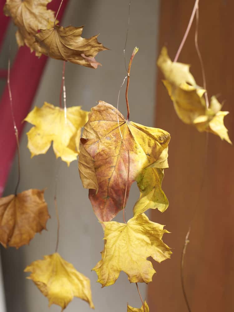 Überall sind trockene, bunte Herbstblätter angedrahtet und schaffen ein herbststimmiges Gesamtbild.