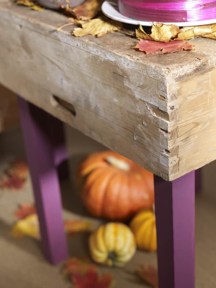 So einfach lassen sich kleine Tischchen zur Präsentation von Floristik und Produkten erstellen! Einfach eine alte Wein- oder sonstige Holzkiste umdrehen, in den Ecken vier stabile, gleichlange Holzlatten anschrauben – fertig ist die Präsentationsebene.