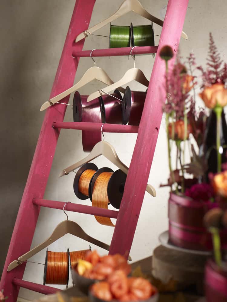 Eine farblich angepasste Holzleiter dient als Warenträger. Bunte Bandrollen sind mithilfe von Holzbügeln aufgehängt.