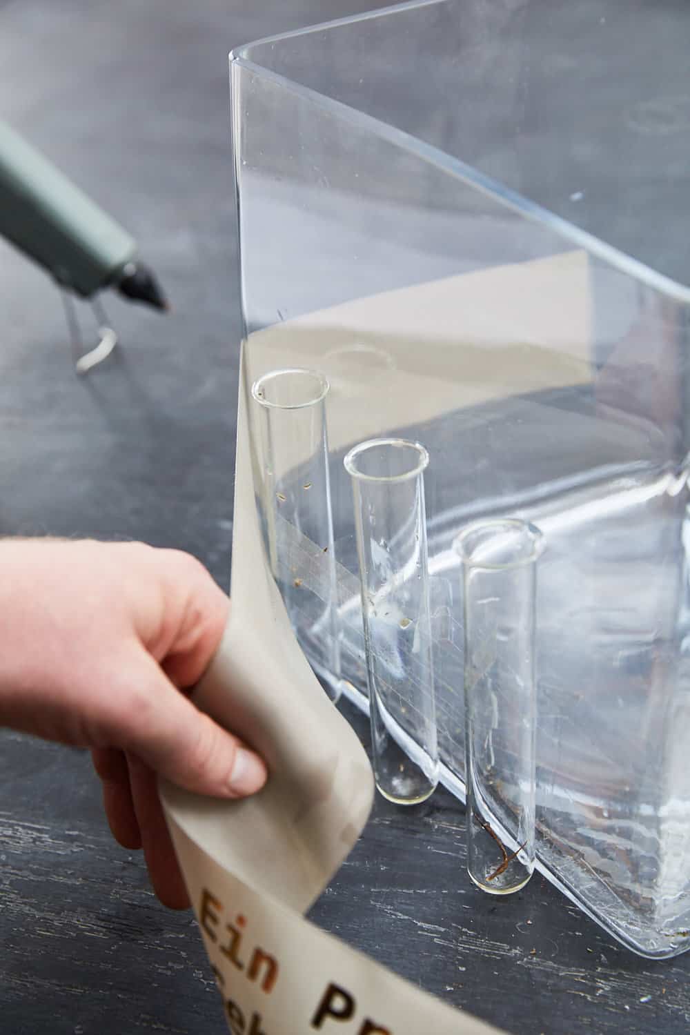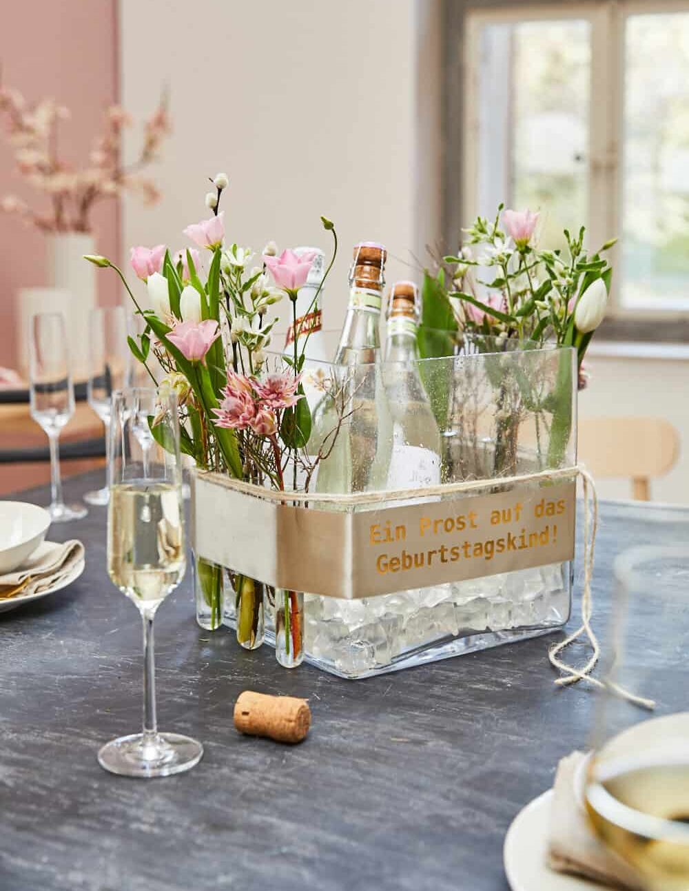 Mehrere Reagenzgläser mit Klebeband an der eckigen Vase befestigen. Diese mithilfe einer Schwanenhalsflasche mit Wasser auffüllen. Das Schleifenband mithilfe des Schleifendruckers von HRMTEC mit der Geburtstagsbotschaft versehen. Anschließend die Bindestellen der Reagenzgläser mit dem Schleifenband kaschieren und überdecken. Zum Schluss die Floralien wie Schönkelch, Seidenblume, Proteen und Tulpen in die Reagenzgläser stellen. Die Weidenkätzchen sowie getrockneten Thymian zwischen Schleifenband und Vase einklemmen.
