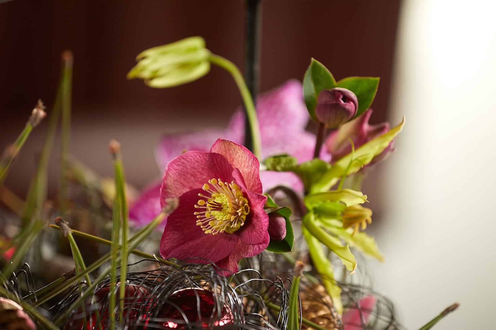 Die ausdrucksstarken heimischen und exotischen großblütigen Floralien richten sich expressiv aus dem wirren Drahtgeflecht nach oben und entfalten sich behauptend gegen die schwarzmatten Kerzen, welchen sich über den Kranz erheben, jedoch keineswegs das Gesamtwerk dominieren.