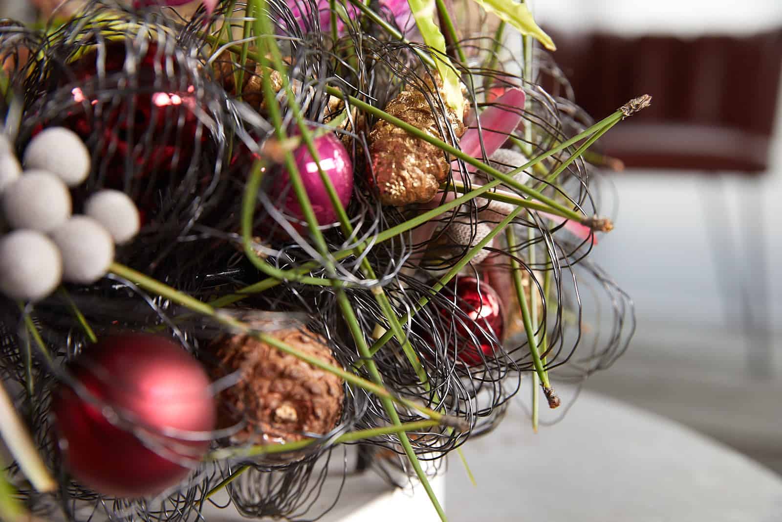 Wickeldraht in gewünschte Länge schneiden, dann mehrere Stränge zusammenfassen und diese schlangenförmig am Grundgestell fixieren. Dann den Wickeldraht auseinanderziehen und aufpuscheln. Nun die Kugeln, Brunia und die ausgezupften Proteen-Blätter im Drahtgewirr einklemmen und hieran befestigen. Wasserröhrchen einsetzen und die Floralien hier einstellen. Zum Schluss die Kerzen auf die Halterung stellen.