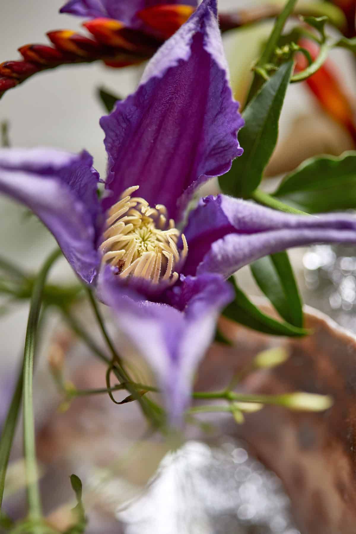 Pflanzliche Werkstoffe: (Marginpar) Montbretie – Crocosmia ‚Prince of Orange‘, Waldrebe – Clematis Amazing® ‚Blue Pirouette‘, Distel – Eryngium ‚Sirius Questar®‘, Strandflieder – Limonium Safora ‚Dark Blue‘, Trommelschlägel – Craspedia ‚Paintball™ Pop‘, Moos, Jasmin – Jasminum officinale sowie Pflanzen (Landgard), Traubenhyazinthe – Muscari armeniacum, Rinde