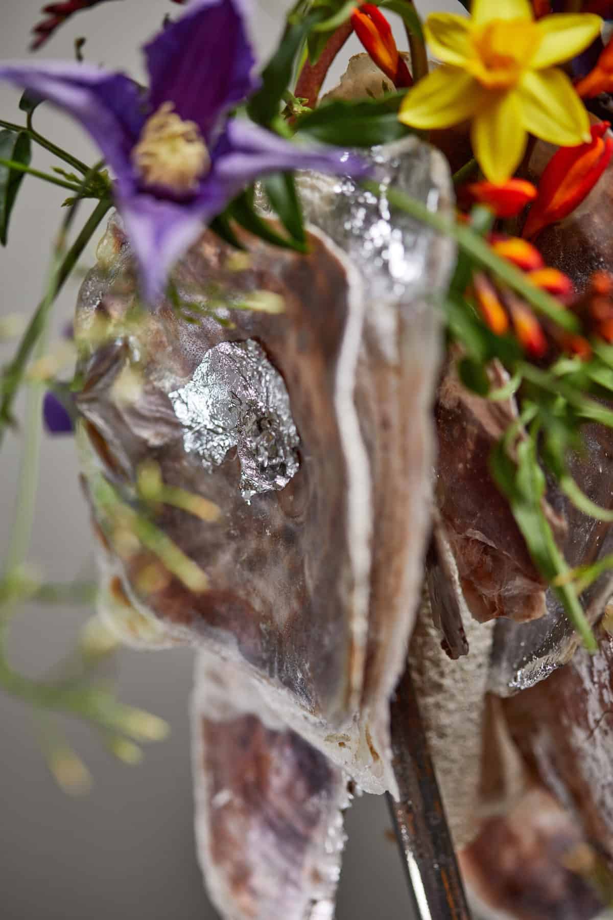 So geht’s: Als Basis dient ein geschweißtes Gestell. Zuerst ein Loch mittig in die Perlmuttschalen bohren. Glasröhrchen mit Sprühkleber einsprühen und mit Sand ummanteln. Die Perlmuttschalen abwechselnd mit Glasröhrchen auf die Metallstange stecken, die mit Draht an der Metallstange befestigt werden. Mithilfe von silbernem Schlagmetall einige Akzente auf manche Perlmuttschalen setzen. Wasser in die Glasröhrchen füllen und die Blüten einstellen.
