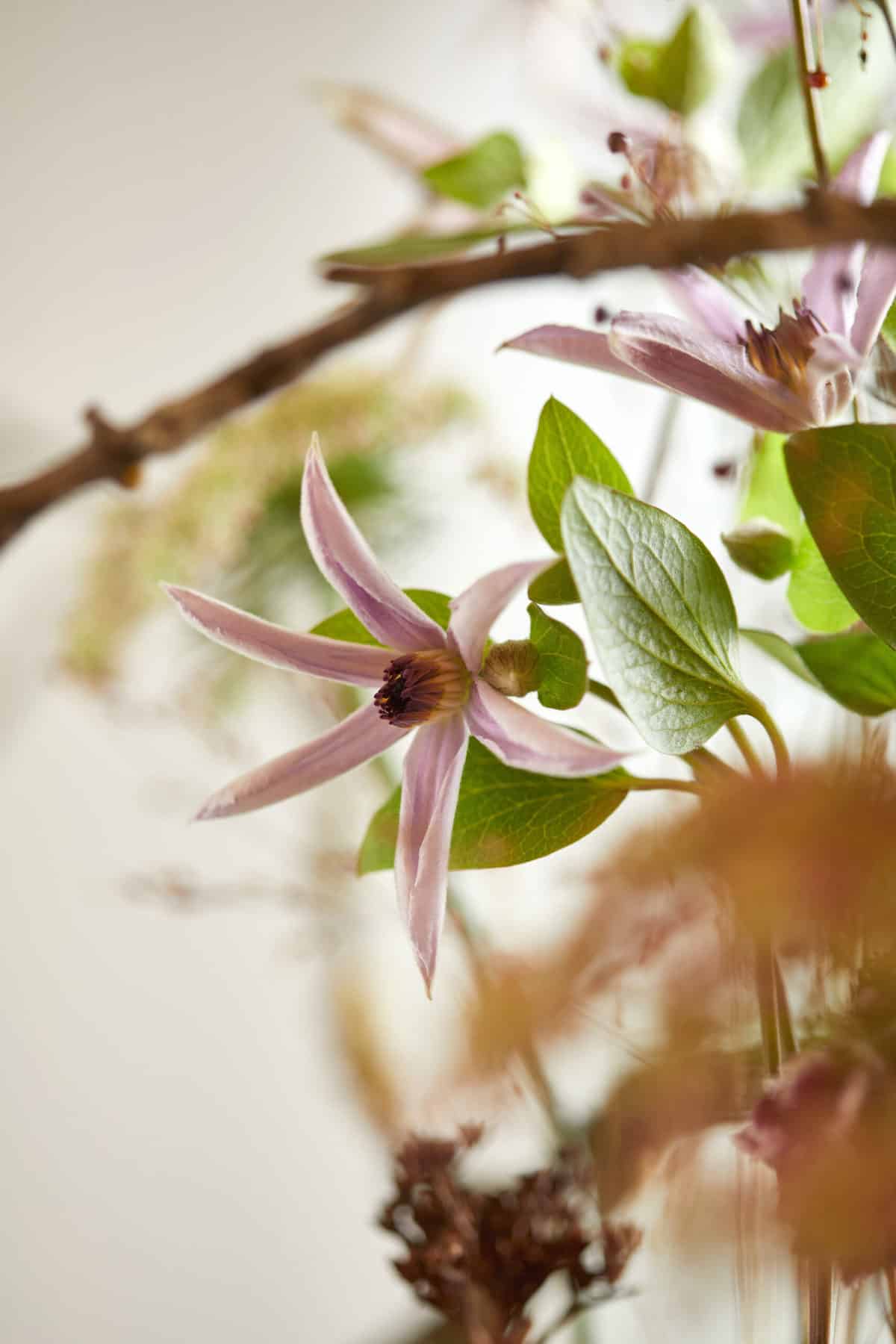 Pflanzliche Werkstoffe: (Marginpar) Waldrebe – Clematis Amazing® ‚Miami‘, Wilde Möhre – Daucus carota ‚Dara‘, Helmkraut – Scutellaria ‚Tinkerbell‘, Erdgingseng- Talinum paniculatum ‚Long John‘, Skabiose – Scabiosa ‚Sweet Cherry Scoop®‘, getrocknete Gräser, Fruchtstände, Zweige, Äste, Bambusrohre