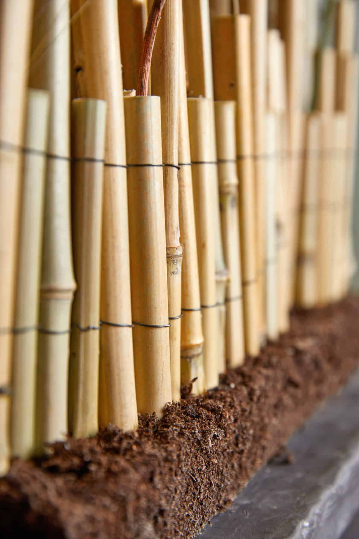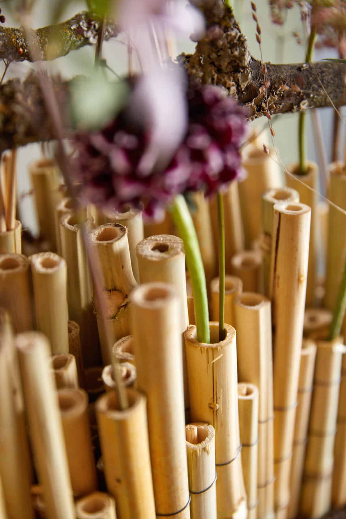 So geht’s: Bambusrohre mithilfe einer Bandsäge in die gewünschten Längen schneiden. Nun die entstandenen Rohrabschnitte mit Wickeldraht zusammenbinden, sodass eine Matte entsteht. Eine ca. 2 cm dicke Holzplatte in die passende Größe schneiden, rundum mit Kleber versehen und sofort Erde darauf streuen. Nun die Bambusmatte senkrecht auf der Basisplatte fixieren. Die Halme mittels einer Schwanenhals-Flasche mit Wasser füllen, was aufgrund der nach unten hin geschlossenen Nodien wie ein Röhrchen funktioniert. Hier hinein die Werkstoffe einstellen. Die Rohre dienen somit als natürliche Steckhilfe.