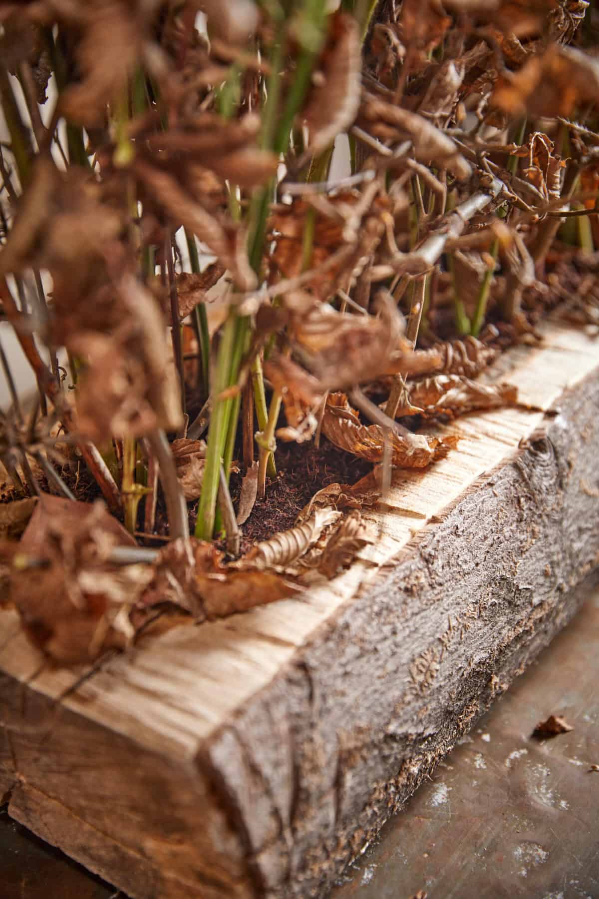 So geht’s: Ein Holzstamm wird zuerst mittig aufgefräst. Nun für einen besseren Stand Füße am Holzstück befestigen. Im Randbereich des Holzstammes Löcher bohren und dort Zweige einstecken. Den Stamm mit Folie auslegen und gewässerten Frischblumensteckschaum einlegen. Anschließend mit Zweigen ein Gerüst als alternative Steckhilfe erstellen und die Werkstoffe einstecken.