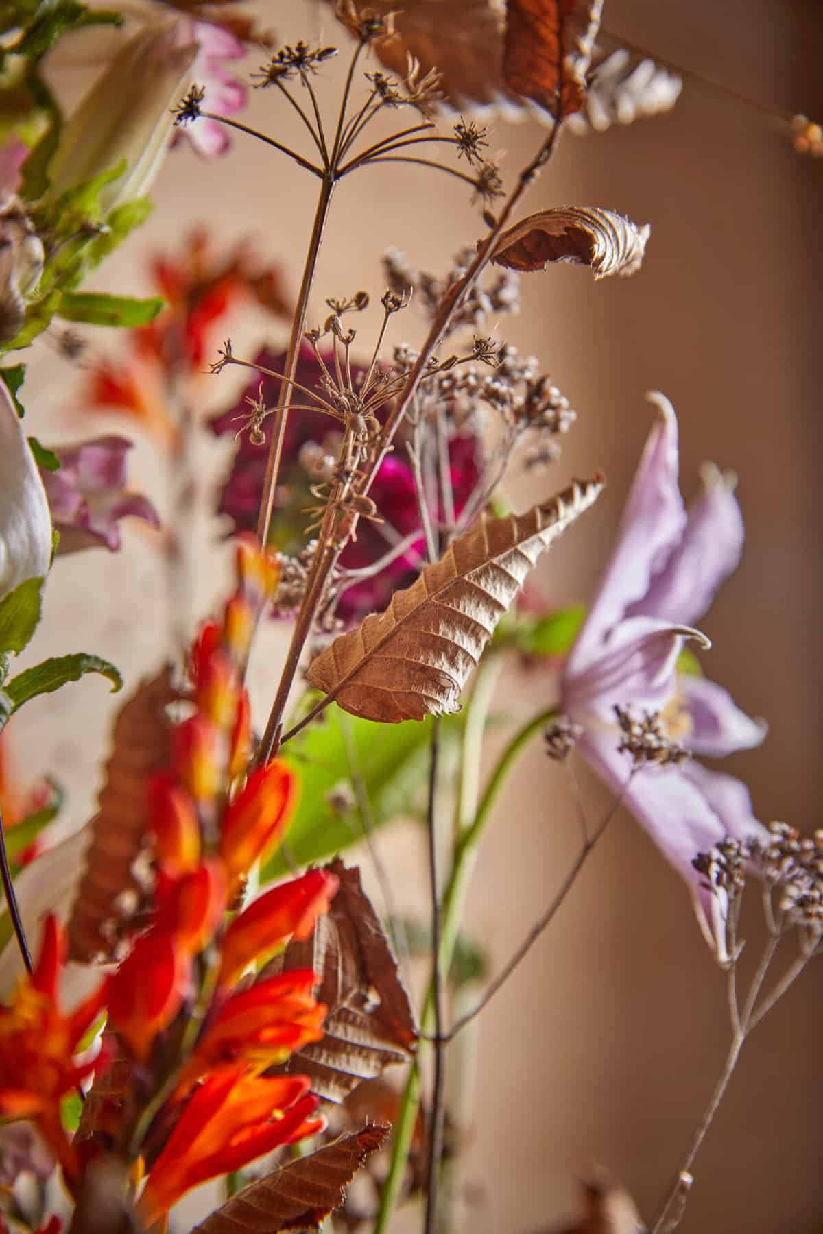 Pflanzliche Werkstoffe: (Marginpar) Montbretie – Crocosmia ‚Prince of Orange‘, Erdgingseng – Talinum paniculatum ‚Long John‘, Waldrebe – Clematis Amazing® ‚London‘, Skabiose – Scabiosa ‚Sweet Cherry Scoop®‚, Skabiose – Scabiosa ‚Red Velvet Scoop®‚, Helmkraut – Scutellaria ‚Tinkerbell‘, Glockenblume – Campanula medium ‚Champion Pink‘, Schafgarbe – Achillea ‚Paprika‘, Hainbuche – Carpinus betulus, Wilde Disteln, getrocknete Materialien