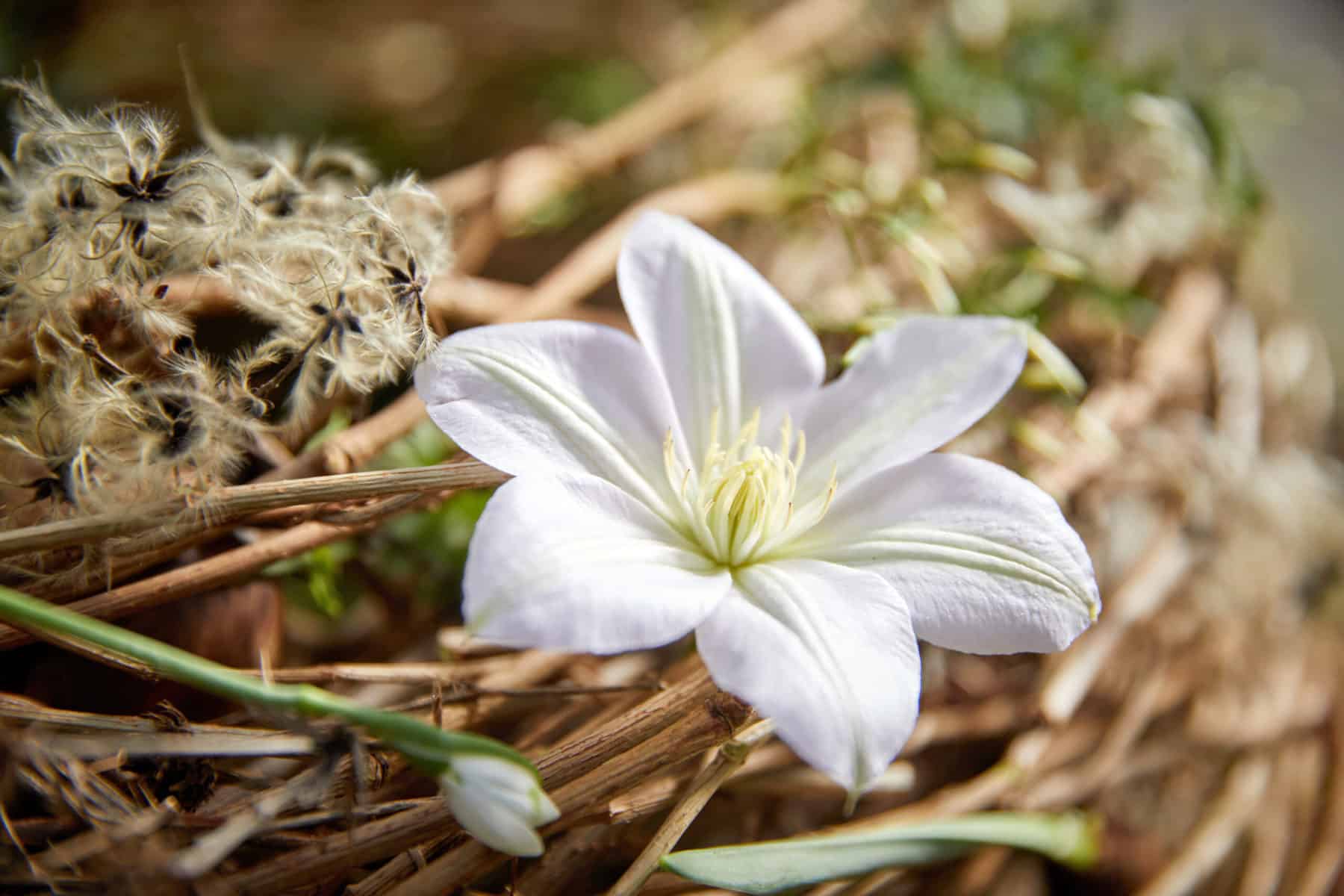 Pflanzliche Werkstoffe: Waldrebe – Clematis Amazing® ‚Vienna‘ (Maginpar), Silberblatt – Lunaria annua, wilde Disteln, getrocknet – Eryngium planum ‚Blauer Zwerg‘, Schlingknöterichranken – Fallopia aubertii, Waldrebenranken – Clematis vitalba, Moos, Jasmin – Jasminum officinale, Schneeglöckchen – Galanthus ‚Snowfox‘, Hauswurz – Sempervivum Cultivar (Landgard)