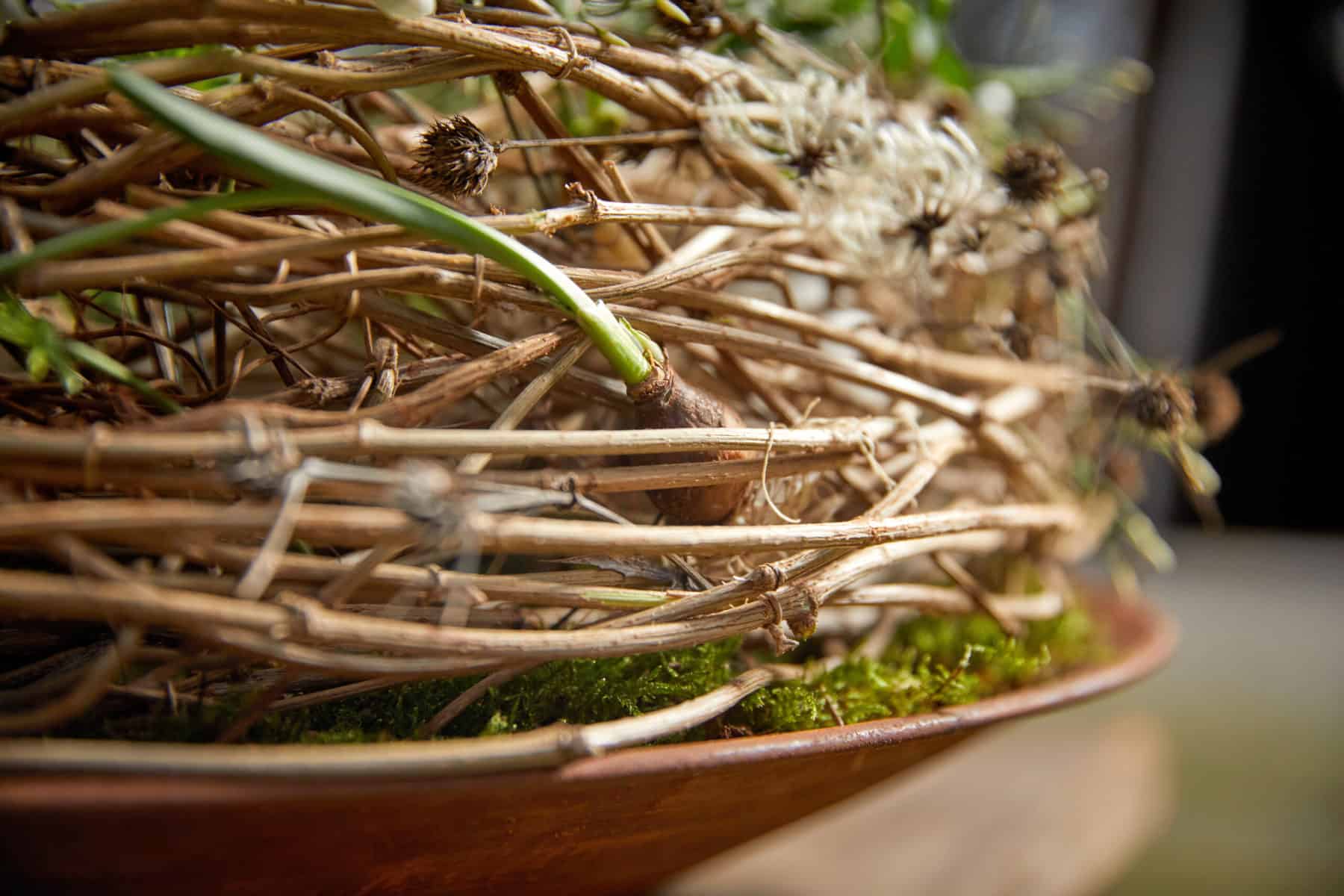 Das Sprießen der Frühblüher und das Recken ihrer Köpfe zur Sonne, gepaart mit getrockneten Naturmaterialien, hat Anna Günther in ihren Werkstücken in verschiedenen Facetten aufgegriffen.