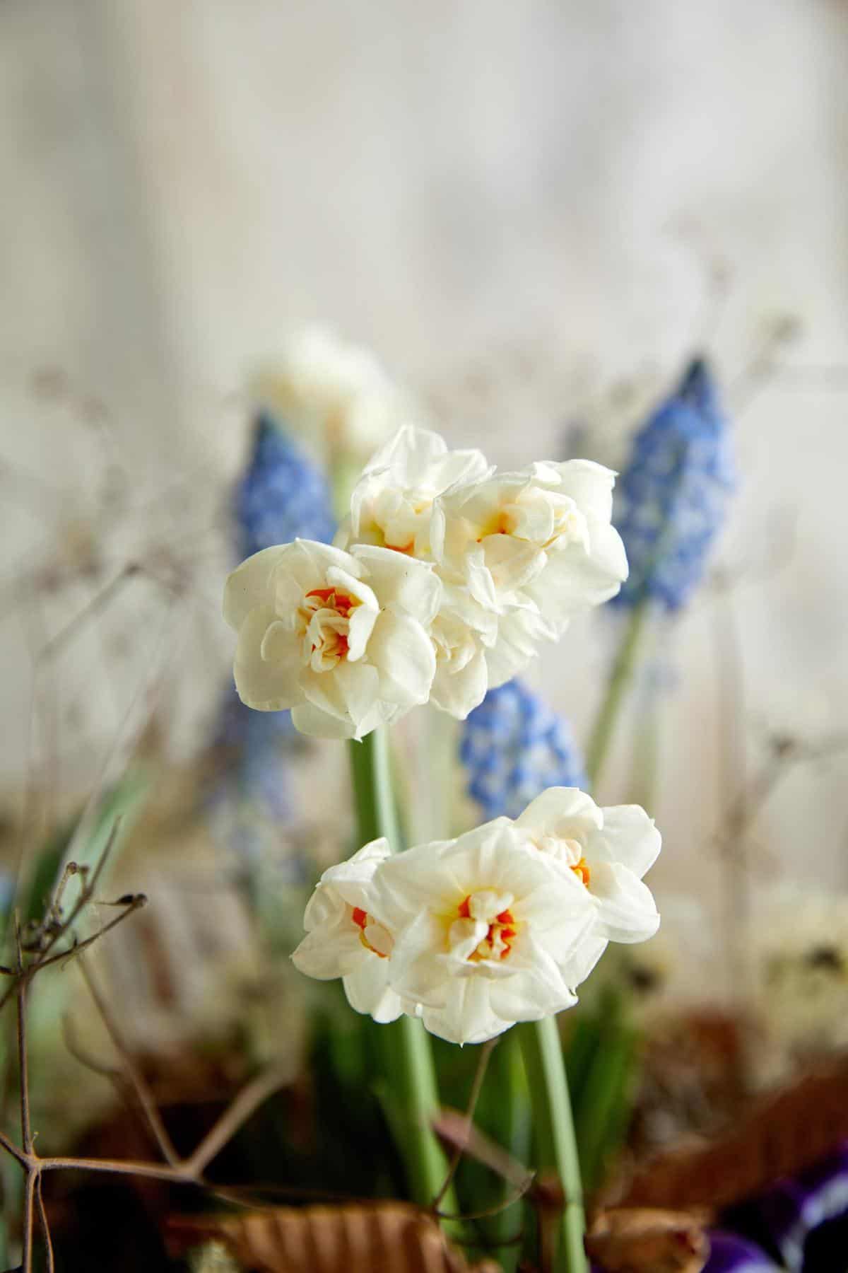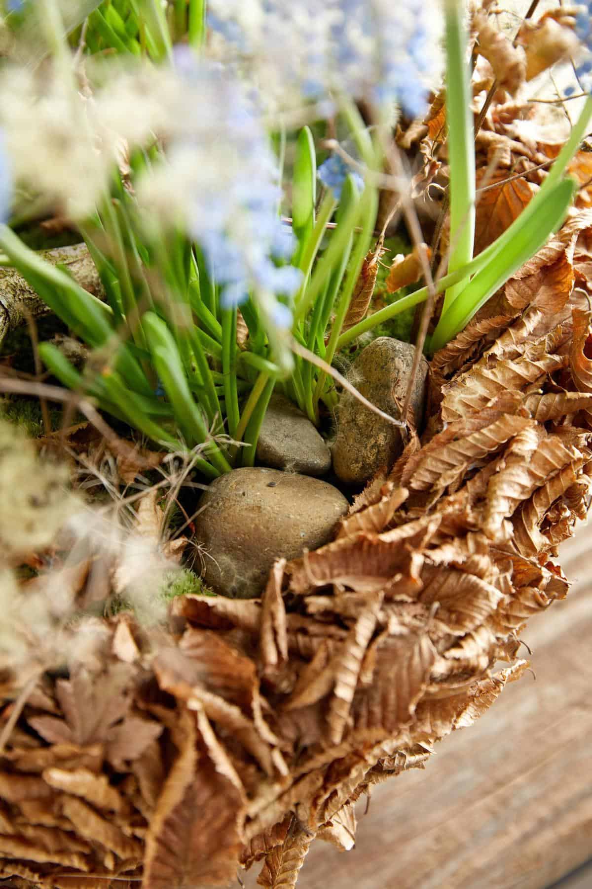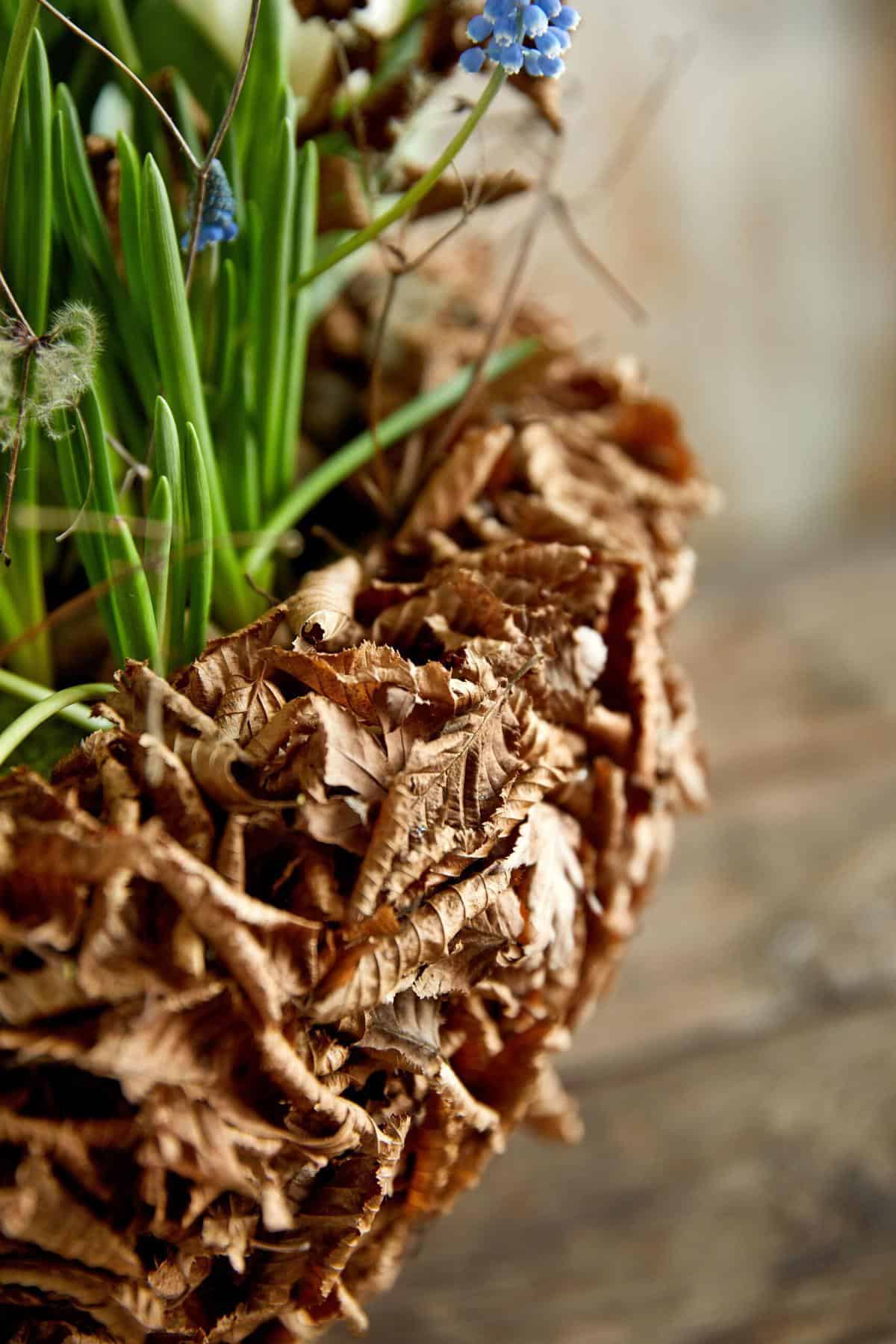 Pflanzliche Werkstoffe: Schneeglöckchen – Galanthus ‚Snowfox‘ (Landgard), Stiefmütterchen – Viola wittrockiana (Landgard), Narzisse – Narcissus ‚Bridal Crown‘ (Landgard), Tulpe – Tulipa ‚Crispa‘ (Landgard), Traubenhyazinthe – Muscari ‚Big smile‘ (Landgard), Hainbuche – Carpinus betulus, Moos, Waldrebe – Clematis vitalba, getrocknetes Material, Holzscheibe, Styropor-Halbkugel, Holzleim, Schraube und Mutter