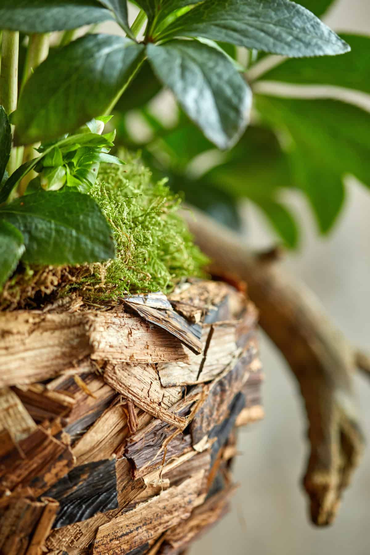 So geht’s: Die leuchtend rote Lenzrose in eine Holzkugel einpflanzen. Zweige einstecken und die Erde mit Moos abdecken.