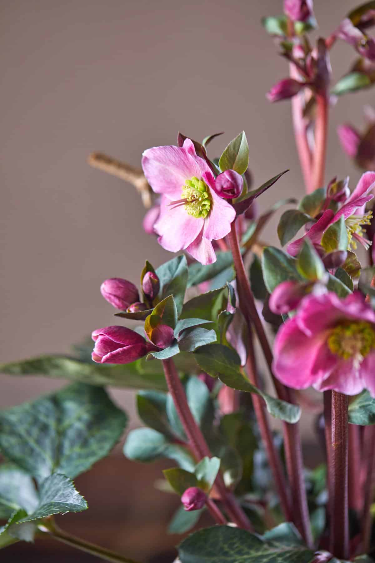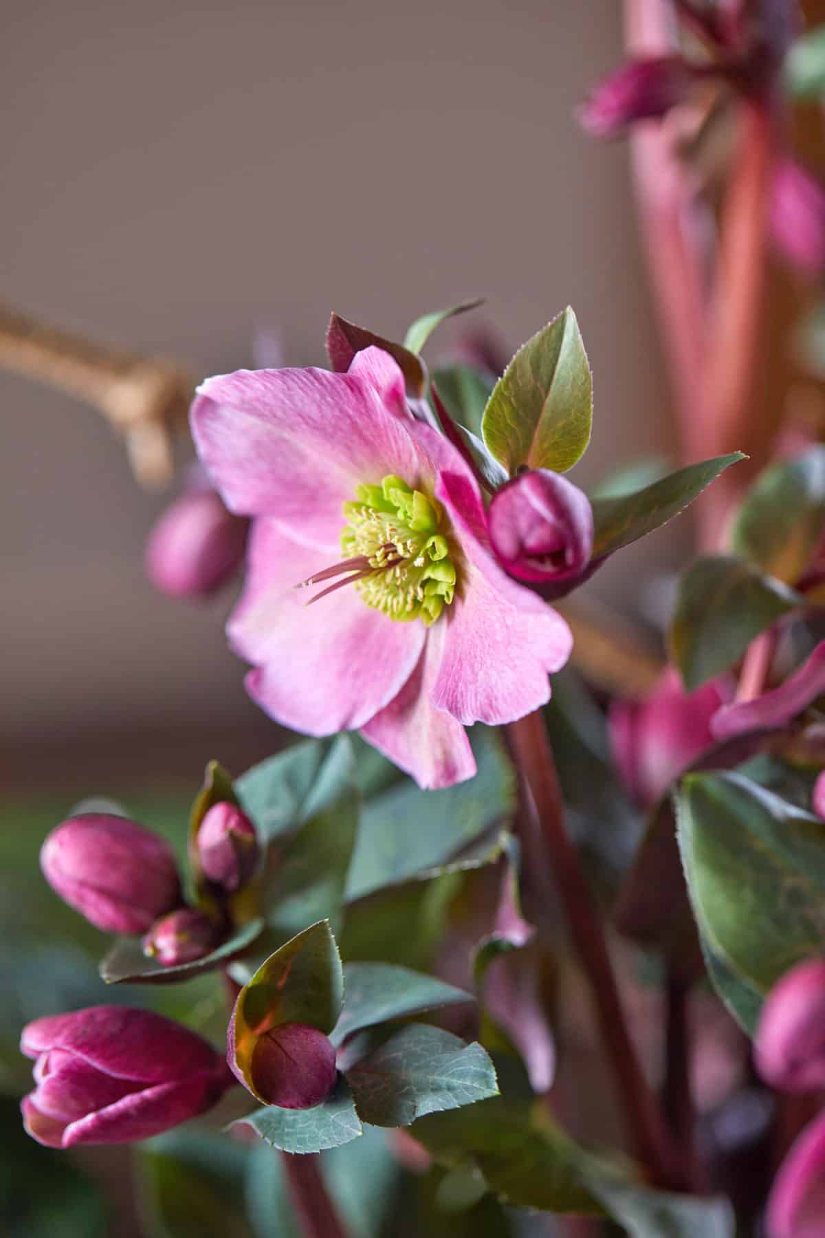Pflanzliche Werkstoffe: Lenzrose – Helleborus orientalis ‚Anna’s Red (Verboom), Moos, Zweige, Holzkugel
