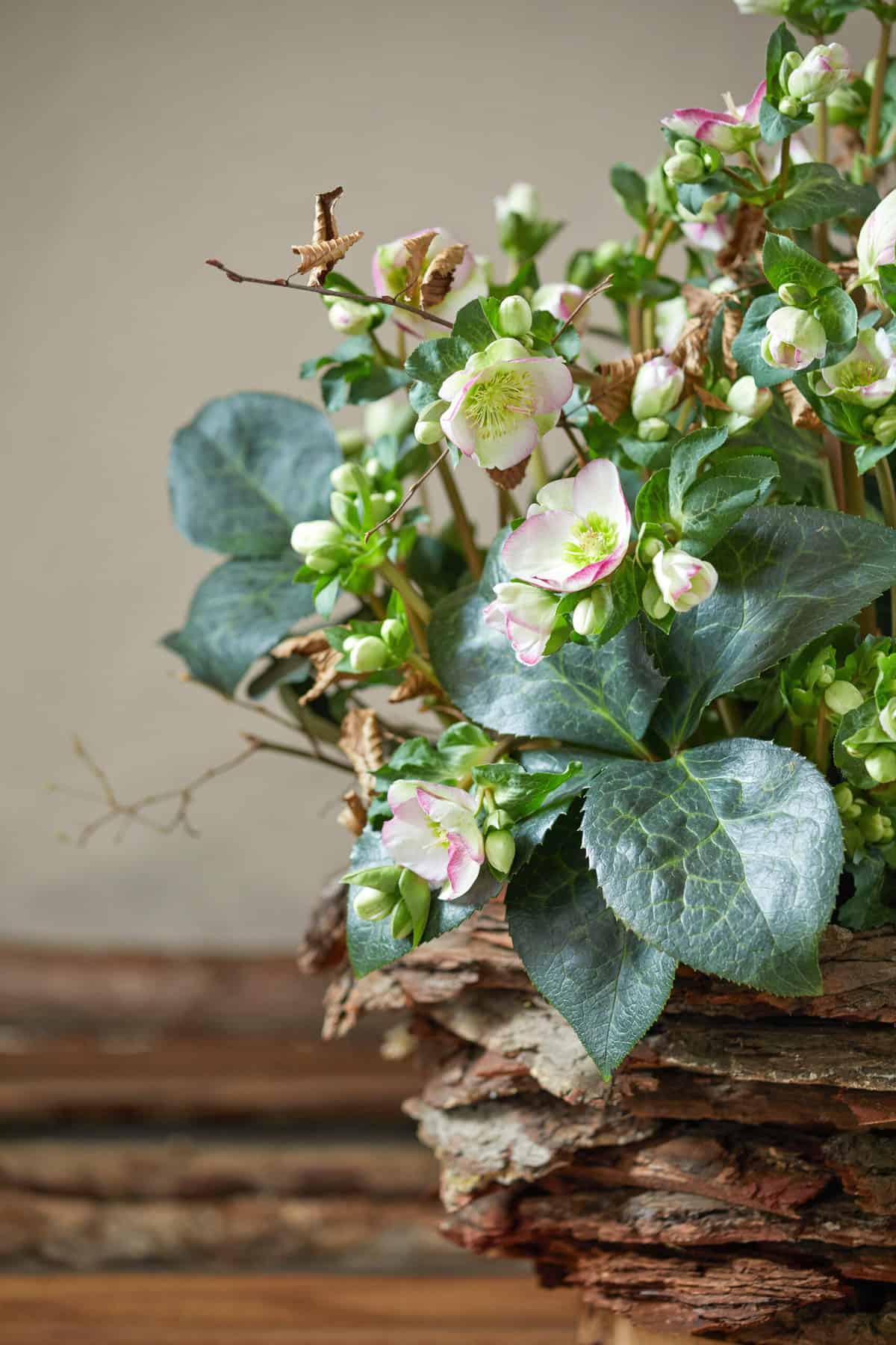 So geht’s: Die weiße Lenzrose in ein mit Folie ausgelegtes Gefäß aus geschichteten Rindenstücken einpflanzen und mit belaubten Hainbuchenzweigen bestecken.