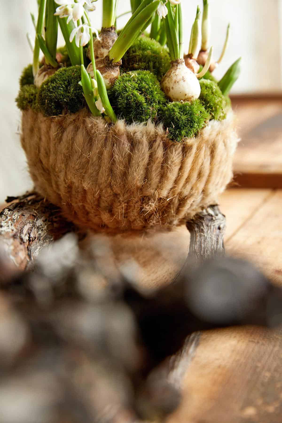 So geht’s: Eine Halbkugel in passender Farbe streichen, trocknen lassen. Diese mit Samtgras bekleben und am Rebenholz durch Schrauben fixieren. Moosbüschel andrahten und in die Kugel einstecken. Frühlingzwiebeln andrahten oder auf Holzstäbchen stecken, ins Werkstück einarbeiten.