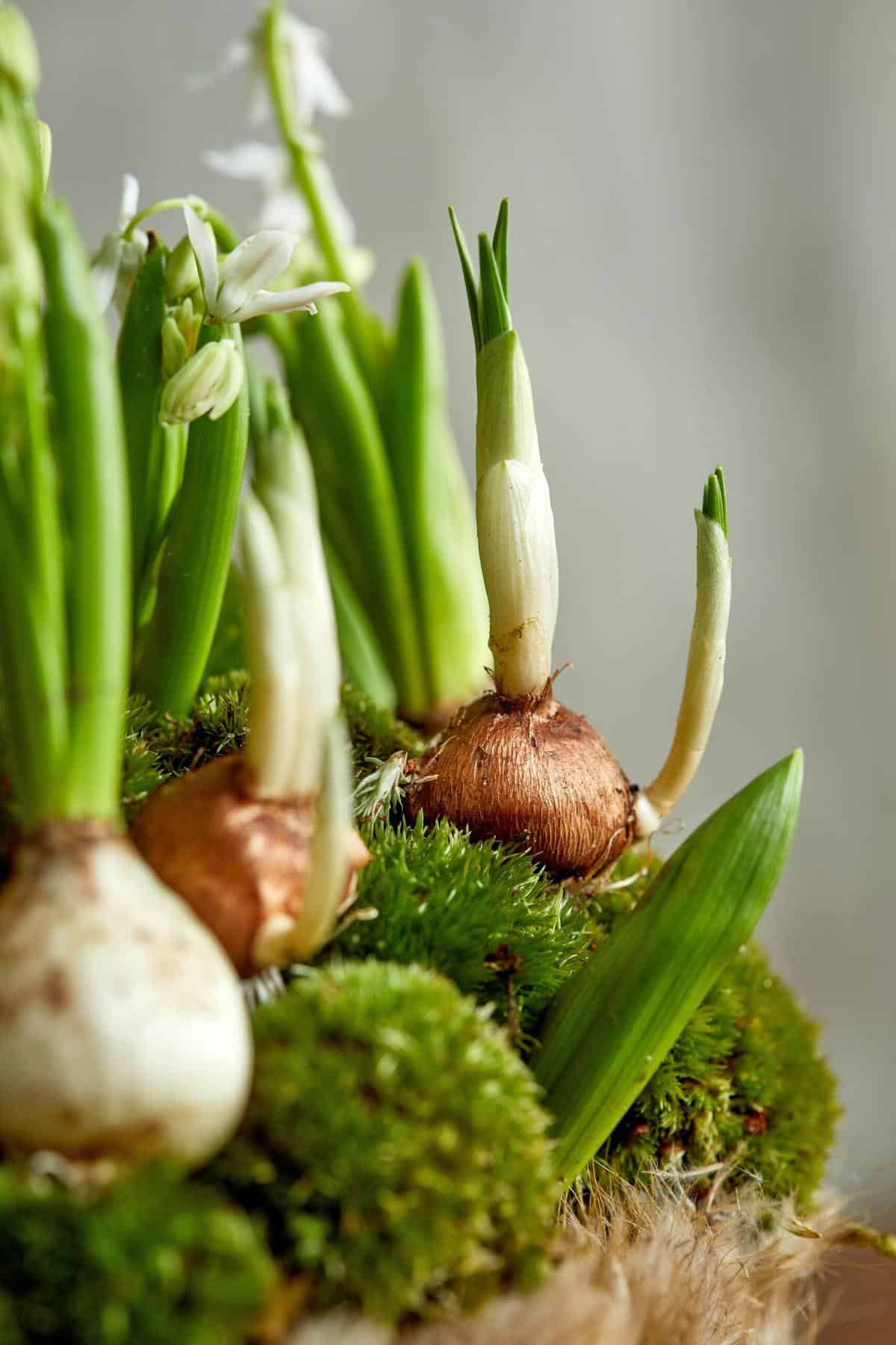 Pflanzliche Werkstoffe: Sibirische Blaustern – Scilla siberica ‚Alba‘, Krokus – Crocus ‚Wit‘ (Landgard) Moos, Samtgras, Hasenschwanzgras – Lagurus ovatus