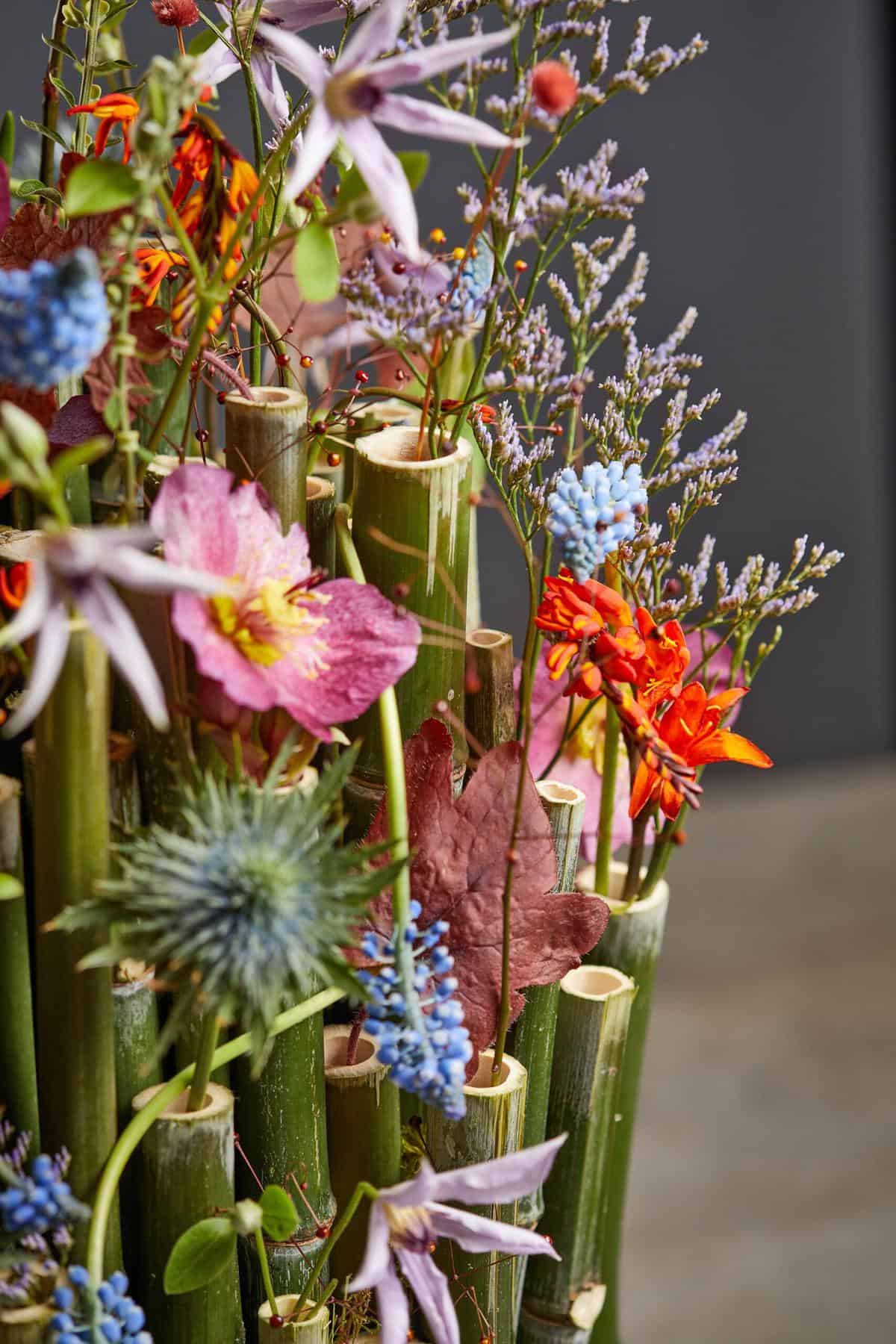 Pflanzliche Werkstoffe: (Marginpar) Waldrebe – Clematis Amazing® ‚London‘, Waldrebe – Clematis Amazing® ‚Miami‘, Distel – Eryngium ‚Magnetar Questar®‚, Montbretie – Crocosmia ‚Prince of Orange‘, Erdgingseng- Talinum paniculatum ‚Long John‘, Strandflieder – Limonium ‚Skylight‘, Helmkraut – Scutellaria ‚Tinkerbell‘, Lenzrose – Helleborus orientalis (Verboom), Traubenhyazinthe – Muscari ‚Big smile‘ (Landgard), Bambus – Fargesia murielae, Moos