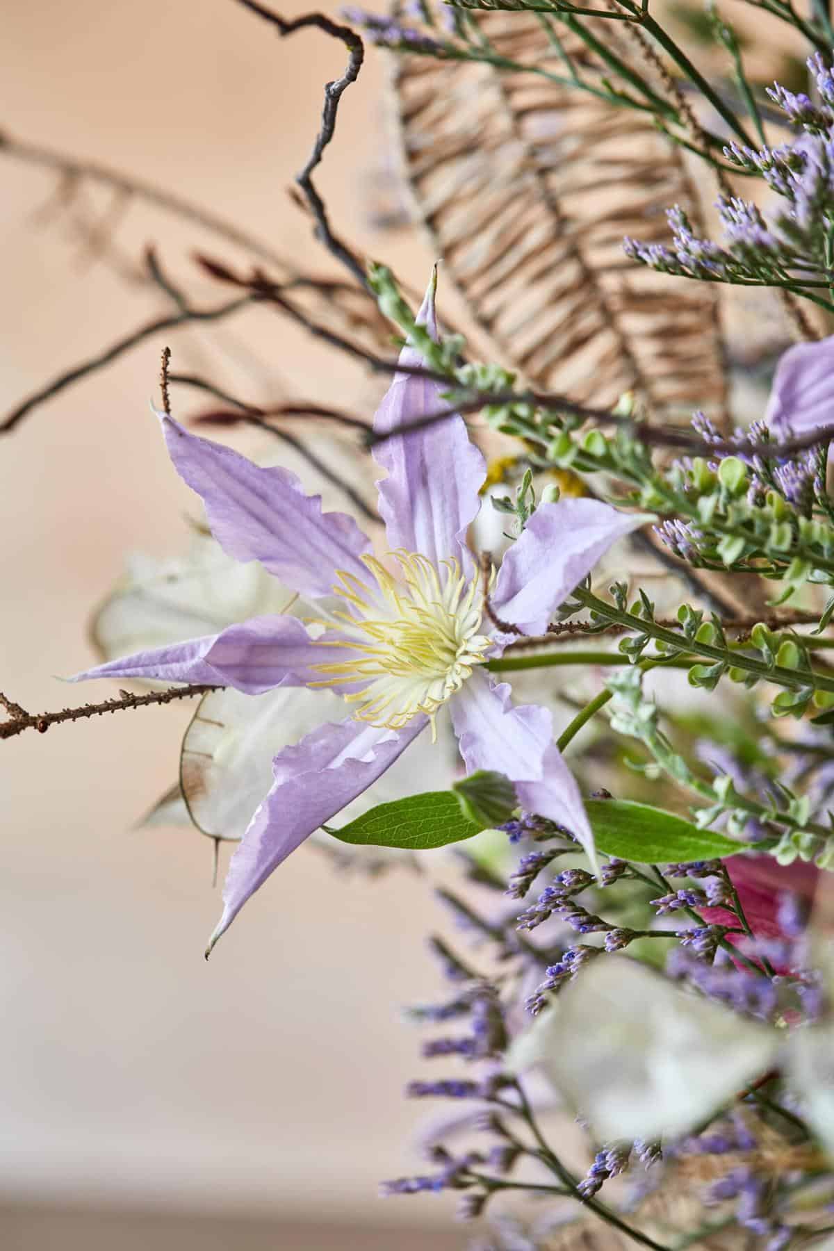 Pflanzliche Werkstoffe: (Marginpar) Strandflieder – Limonium ‚Skylight‘, Waldrebe – Clematis Amazing® ‚Havana‘, Waldrebe – Clematis Amazing® ‚London‘, Plattährengras – Chasmanthium Latifolium ‚Mantis‘, Distel – Eryngium ‚Magnetar Questar®‘, Wilde Möhre – Daucus carota ‚Dara‘, Glockenblume – Campanula medium ‚Champion Lavender‘, Helmkraut – Scutellaria ‚Tinkerbell‘, Äste, Lenzrose – Helleborus orientalis (Verboom)