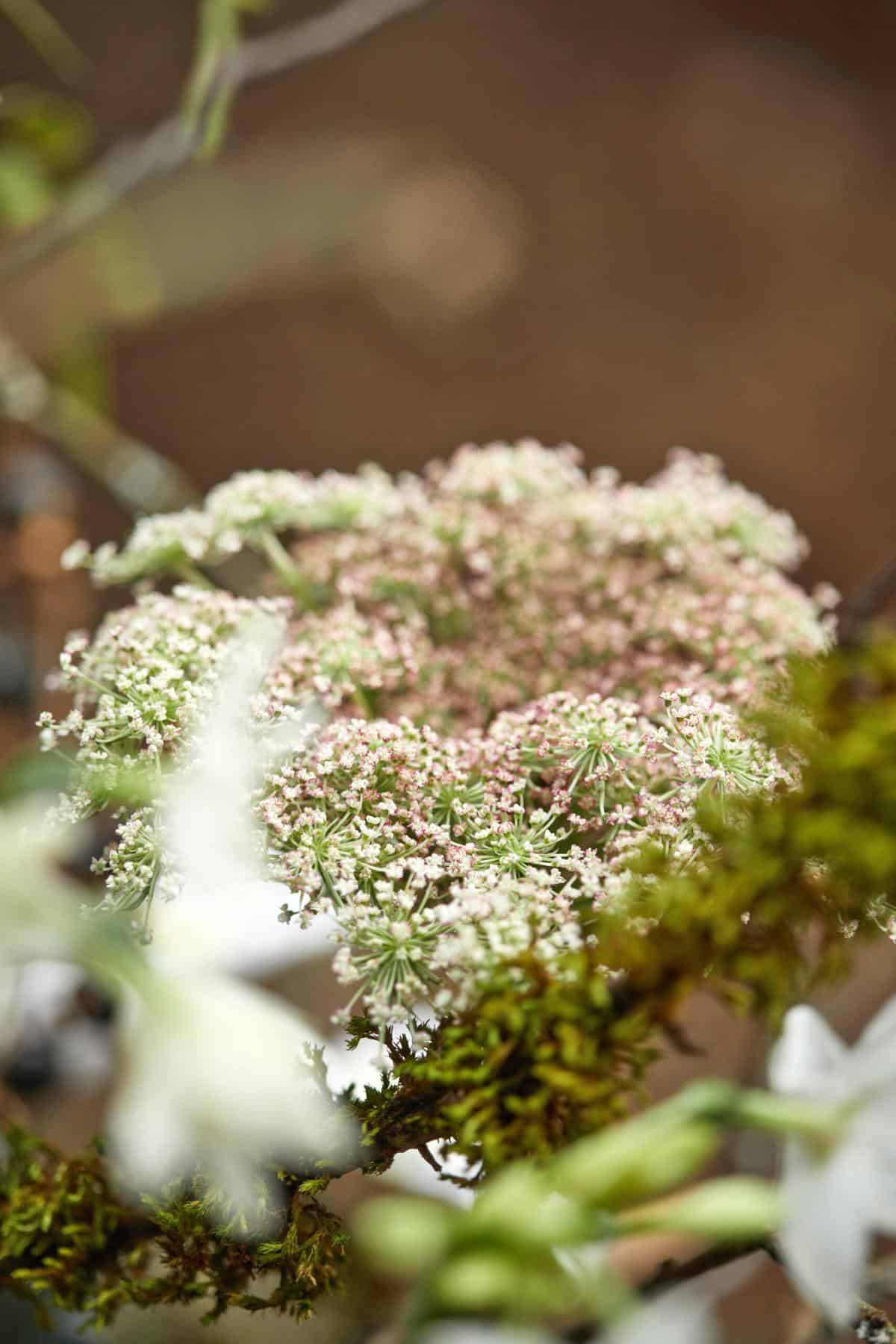 Pflanzliche Werkstoffe: (Marginpar) Waldrebe – Clematis Amazing® ‚Vienna‘, Wilde Möhre – Daucus carota ‚Dara‘, Distel – Eryngium ‚Sirius Questar®‚, Plattährengras – Chasmanthium Latifolium ‚Mantis‘, Tazetten-Narzisse – Narcissus tazetta ‚Paperwhite Ziva‘ (Landgard), Black Berry-Zweige – Alpinia allughas, Christrosenblätter – Helleborus niger, Äste,