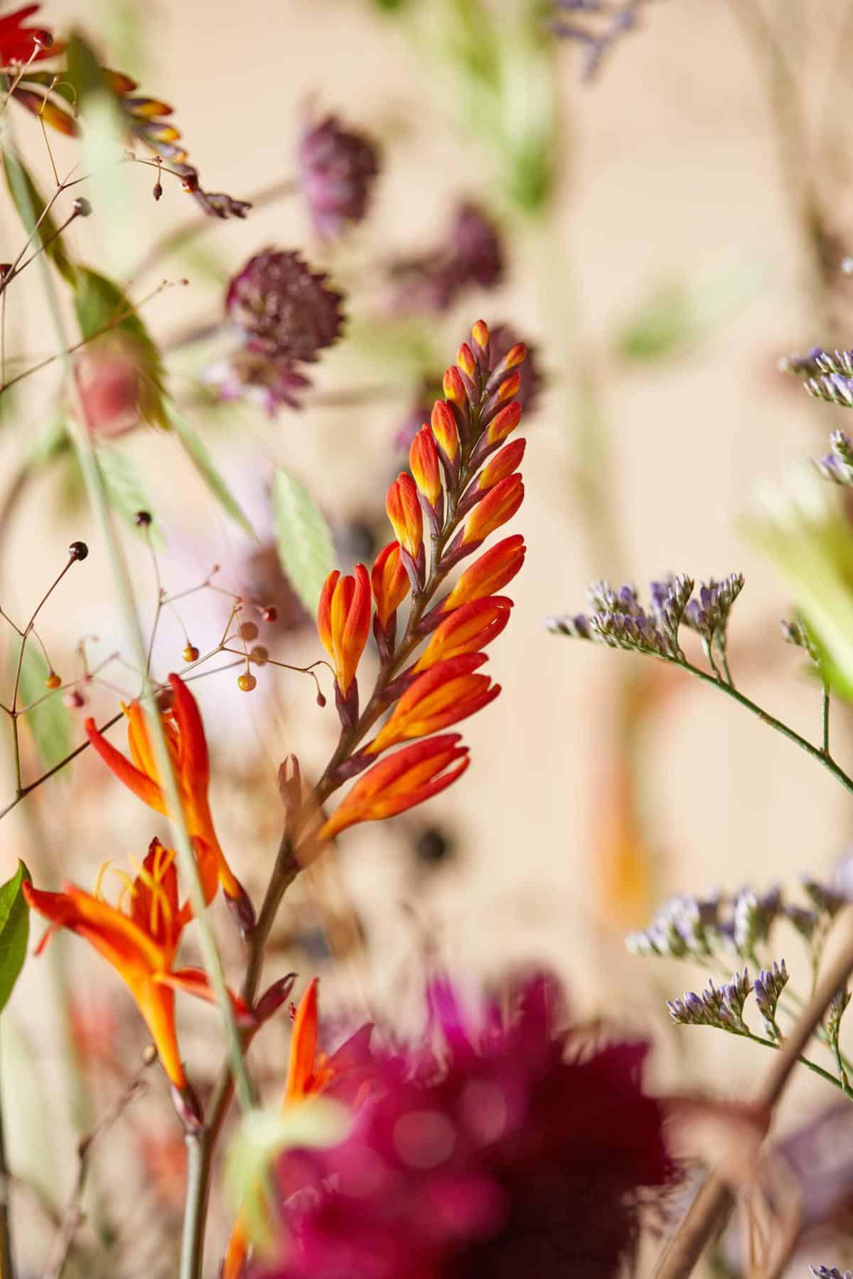 Pflanzliche Werkstoffe: (Marginpar) Große Sterndolde – Astrantia major ‚Star of Love®‚, Waldrebe – Clematis Amazing® ‚London‘, Skabiose – Scabiosa ‚Red Velvet Scoop®‚, Erdgingseng- Talinum paniculatum ‚Long John‘, Glockenblume – Campanula medium ‚Champion Lavender‘, Strandflieder – Limonium ‚Skylight‘, Montbretie – Crocosmia ‚Prince of Orange‘, Kugelgras, Birke – Betula pendula Black Berry, Zweige – Alpinia allughas
