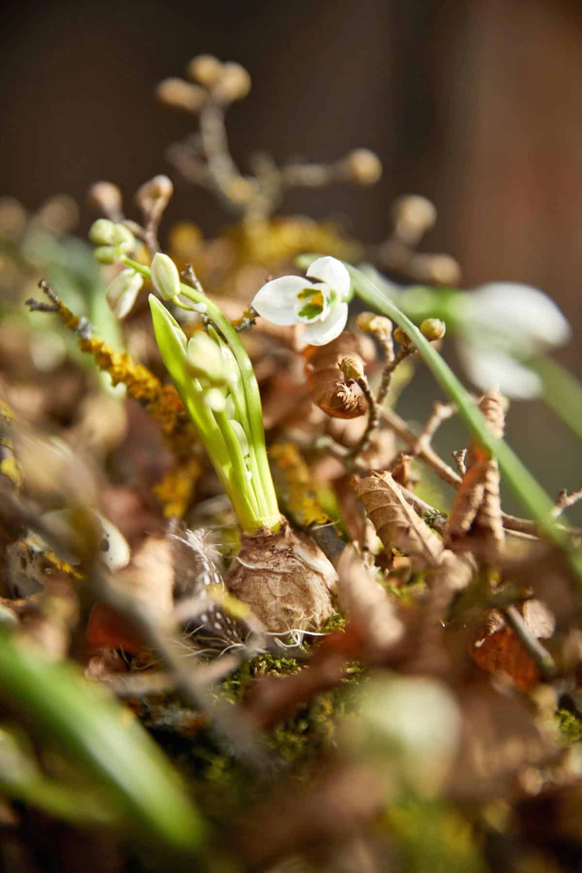 Pflanzliche Werkstoffe: Sibirische Blaustern – Scilla siberica ‚ ‚Alba‘, Krokus – Crocus ‚Tricolor‘, Schneeglöckchen – Galanthus ‚Snowfox‘ (Landgard),  Sternmoos – Sagina subulata, Laub, Äste