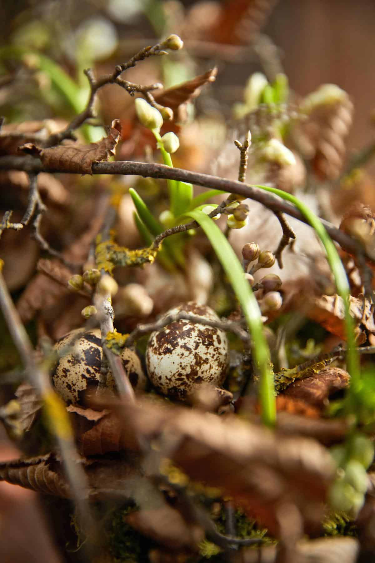 So geht’s: Erde mit Hilfe von Sprühkleber auf einen Styroporbogen auftragen. Im oberen Bereich Moos, Äste und Laub befestigen. Frühlingsblumen austopfen, auswaschen und die Zwiebeln zwischen den Ästen einklemmen und fixieren. Federn sowie Wachteleier als Schmuckelemente auf dem Bogen dekorieren.