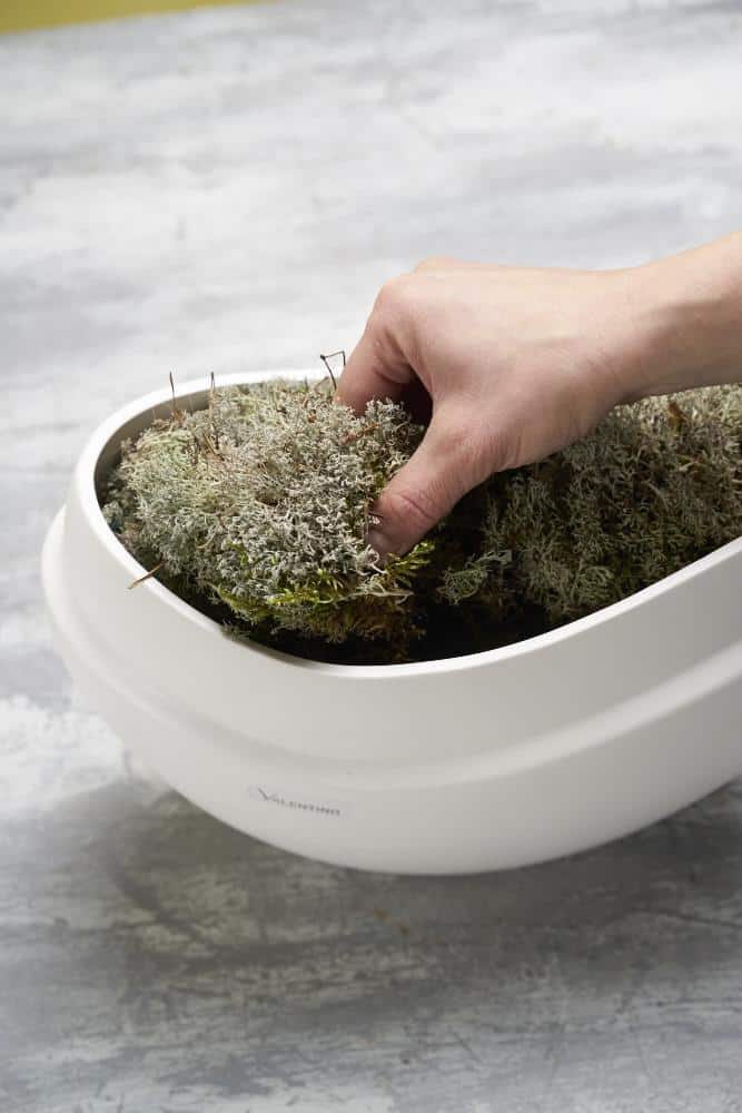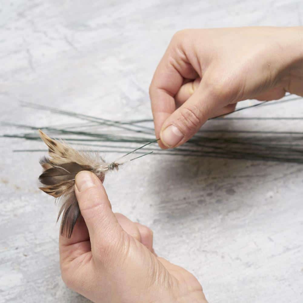 Zunächst werden die Federn angedrahtet (Bild 1), um sie später in den Randbereich des Gestecks einstecken zu können. Anschließend wird der Frischblumen-Steckschaum gewässert und in das Gefäß gefüllt, dann die Federn um den Rand stecken. Jetzt bedeckt ihr noch die Steckschaumbasis mit Flechten-Stücken und fügt die Frischblumen ein.