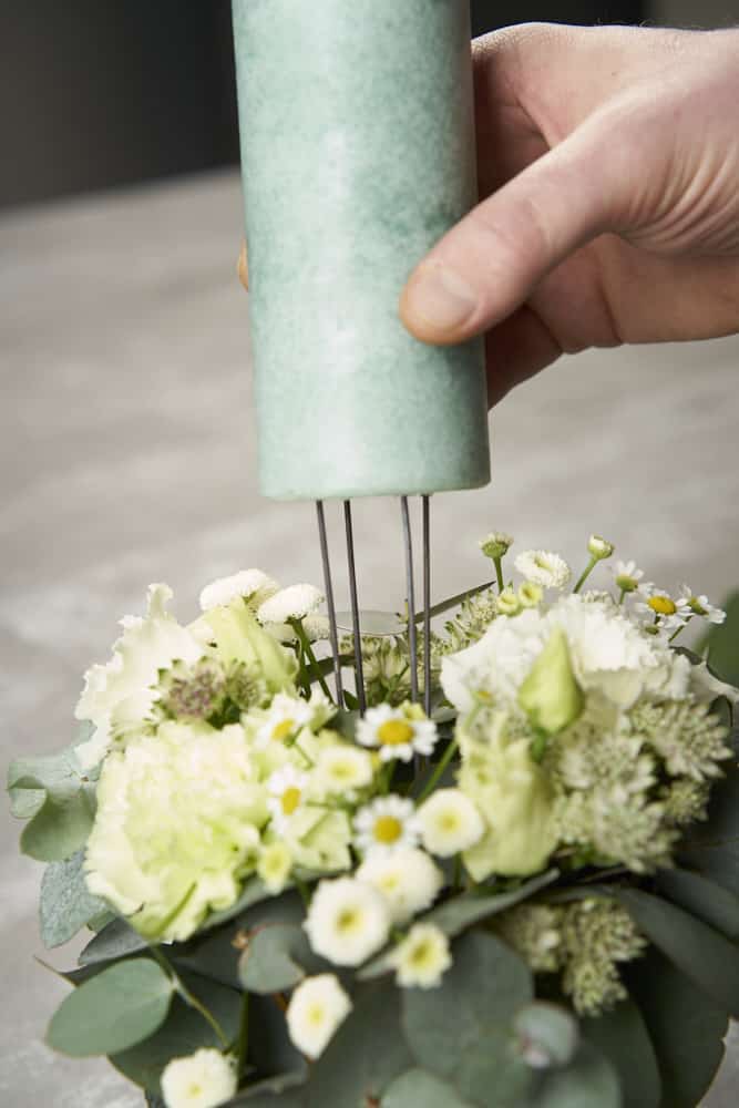 Astrantia major, Dianthus caryophyllus, Eucalyptus cinerea, Eustoma grandiflorum, Tanacetum parthenium, Kerze (Wenzel Kerzen) Kordel (Vivant) Untersetzer Steckdraht (BUCO) Pinholder, Knetkleber, Frischblumensteckschaum-Zylinderstange (alles OASIS® FLORAL PRODUCTS)