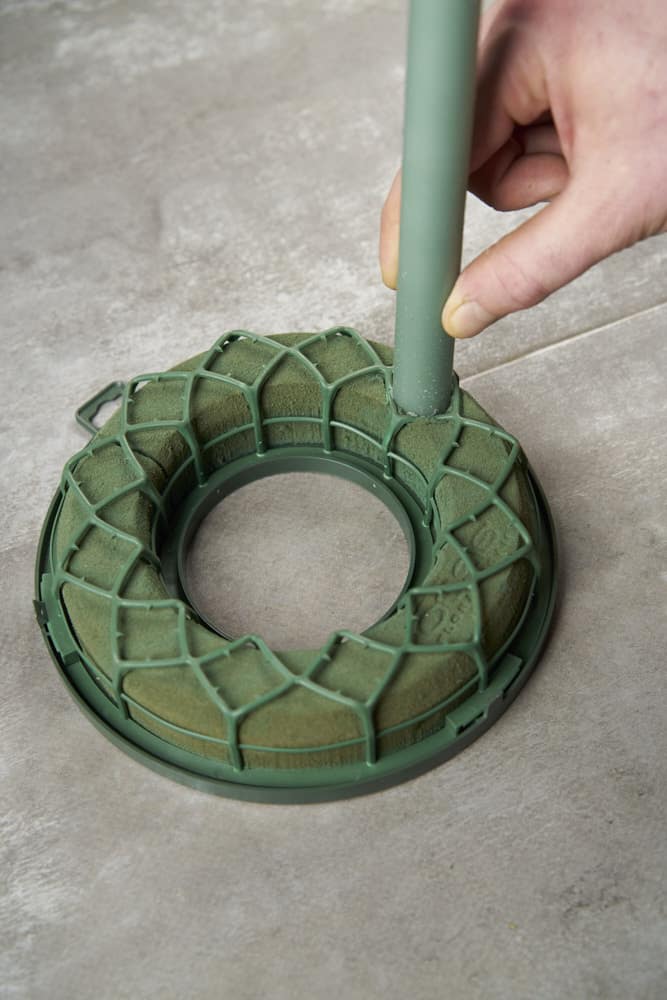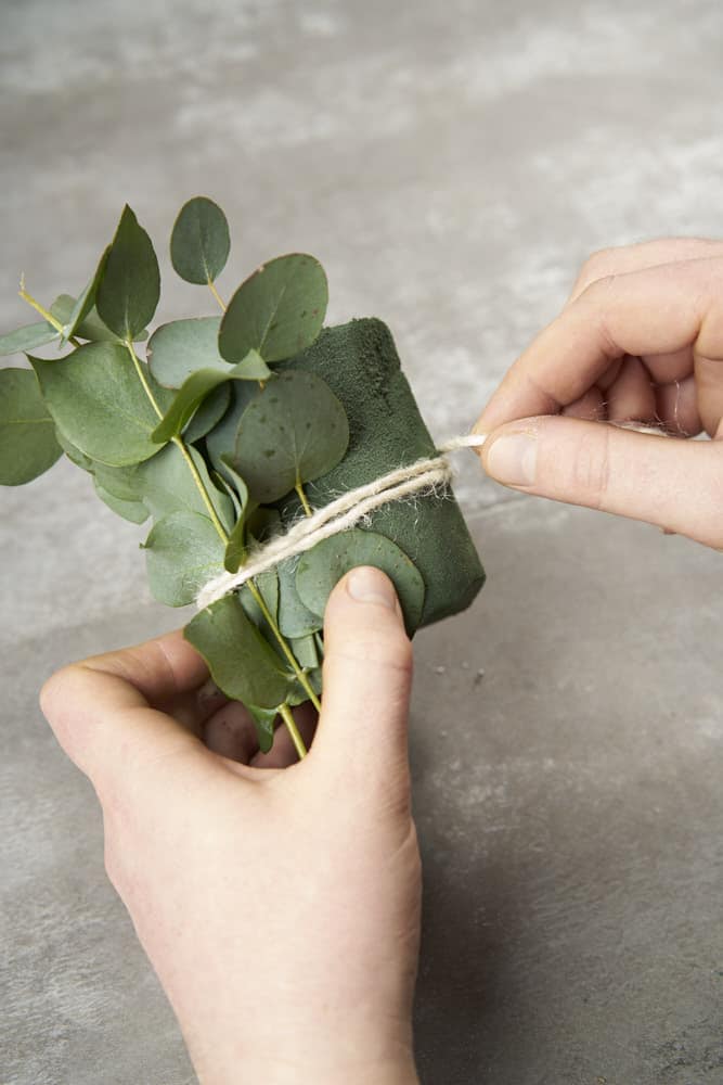 Frischblumensteckschaum-Zylinder mithilfe von Kordel mit Eukalyptus ummanteln. Pinholder auf dem Untersetzer fixieren, Zylinder aufsetzen und bestecken. Kerze andrahten und einfügen.