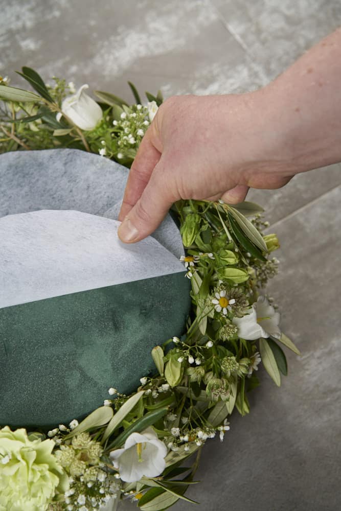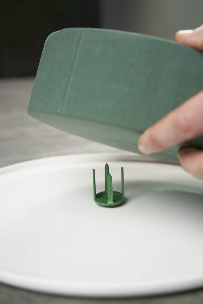 Steckschaumbasis wässern und mithilfe von ein oder zwei Pinholdern auf dem Teller fixieren. Strukturvlies auf die Oberseite des Frischblumensteckschaum-Zylinders legen. Hier die Glasschale für die Schwimmkerzen aufsetzen und seitlich die frischen Floralien einstecken.