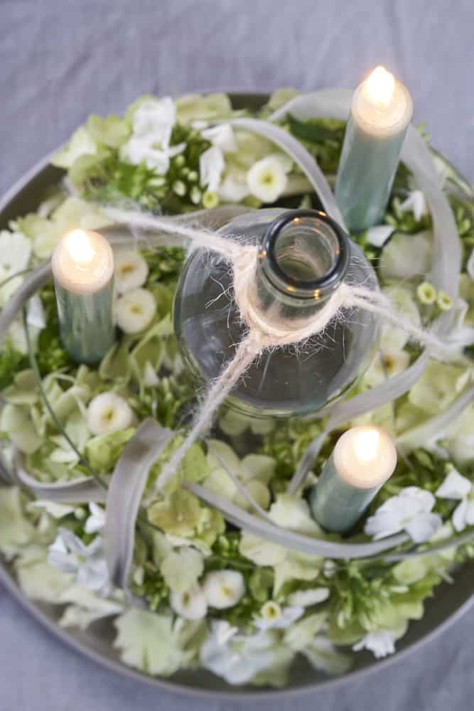 Hydrangea macrophylla, Ophiopogon jaburan, Phlox paniculata, Tanacetum parthenium, Tillandsia xerographica, Kerzen (Wenzel Kerzen) Schnur Flasche Tablett Heißkleber, Frischblumensteckschaum-Ring mit Kunststoffunterlage und -gitter (beides OASIS® FLORAL PRODUCTS)