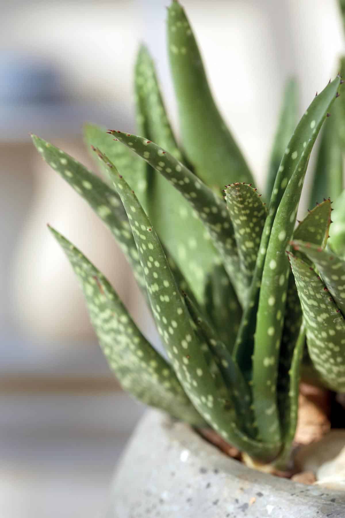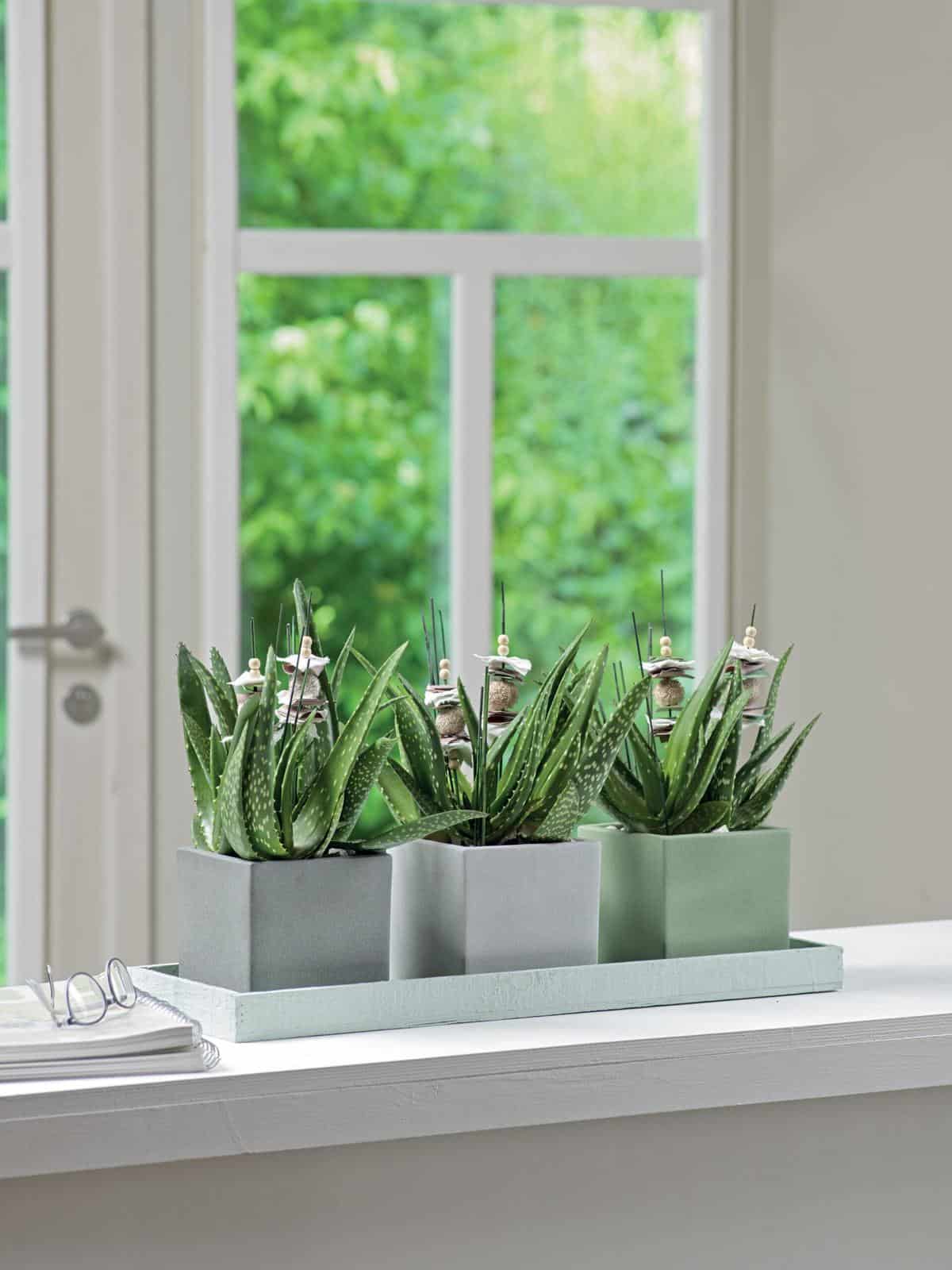 Die Aloe (Aloe vera) ist der Klassiker unter den Sukkulenten. Es gibt rund 250 verschiedene Arten, die durch ihre unterschiedlichen Looks glänzen. An einem sonnigen Plätzchen fühlt sie sich am wohlsten und kann mit voller Kraft gedeihen. Wenn ihr die Möglichkeit habt, die Pflanze im Sommer herauszustellen, dann wäre dies optimal, denn die besseren Lichtbedingungen fördern ihr Wachstum. Achtet beim Gießen darauf, dass das Innere der Rosette nicht feucht wird. In den Wintermonaten sollte sie nur alle vier bis sechs Wochen gegossen werden. Alle zwei Wochen könnte ihr sie – außer im Winter – mit Kakteendünger anreichern. Sie macht nicht nur als Topfpflanze eine gute Figur, sondern wir auch als Heilpflanze gegen Hautkrankheiten und Verletzungen der Haut genutzt. Aus dem Saft des Wasserspeichergewebes der Blätter könnt ihr Hautpflegeprodukte herstellen. Der Saft hilft gegen Neurodermitis, leichten Verbrennungen, Schnittwunden, Haarausfall und Schuppenbildung. Dekorativ ist diese Art allerdings auch, denn sie lässt sich aufgrund ihrer schlichten Farbe und Musterung optimal mit anderen Pflanzen kombinieren. Mit etwas Glück bilden sich an einem langen Stängel in Traubenform angeordnete Blüten. Je nach Sorten können diese gelb, rot oder orange sein. Die Blütenstände solltet ihr, wenn sie verblüht sind, entfernen.