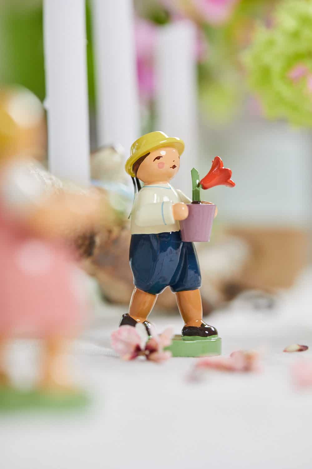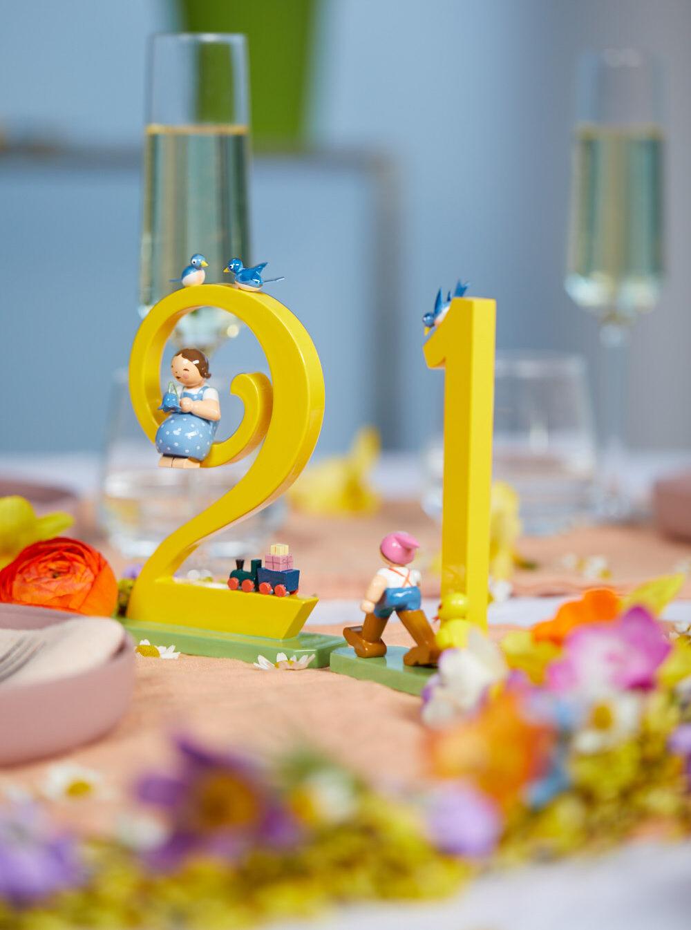 Im Mittelpunkt als Inspiration werden die kleinen Figuren aus der Kindheit genommen, die pausbäckige Kinder in herkömmlicher, ländlicher Kleidung und plakativer Einfachheit darstellen. Die Firma, die noch immer diese Figuren herstellt, setzt damit bewusst auf Erinnerungen an die eigene Kindheit, die im Rückblick idyllisch, liebenswert sowie einfach unbeschwert wirken soll. Durch die dazu passende, ebenso einfache, bunte, fröhlich-stimmende Blütendekoration gehen damit beide Komponenten somit eine ideale Symbiose ein, die den stimmungsvollen Geburtstagstisch ausmachen.