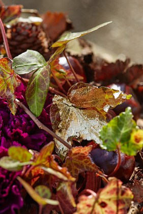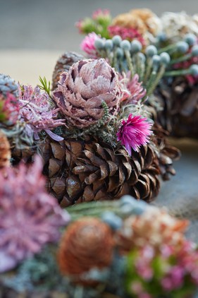 Frischblumensteckschaum-Tropfen wässern. Trockenes Laub seitlich, mit Hilfe von Haften, in den Steckschaum stecken. Eine Reihe aus Muschelzypressen stecken. Zapfen und Kastanien mit Draht und Holzspießen versehen und in die Zwischenräume einstecken. Am oberen Tropfenteil die Hortensienblüten mittig platzieren. Efeublätter mit Schlagmetall versehen und locker über das Werkstück laufen lassen.