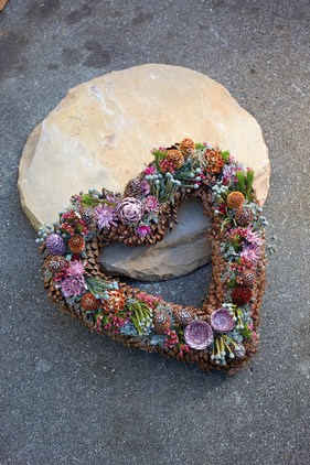 Die Frischblumensteckschaum-Herzunterlage wässern, Zapfen in der Mitte teilen und mit Zierdraht innen und außen an der Unterlage befestigen. Moos mit Haften feststecken. Proteen, Federblütenstrauch und weitere Exoten sowie Blüten einarbeiten.