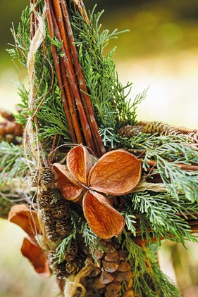 Das Frischblumensteckschaum-Kreuz wässern. Oben und unten jeweils zwei Löcher reinbohren, einen Metallstab dahinterlegen und mit Steckdraht befestigen. Mit einer Flachzange richtig fest zurren, dann die trockenen Zweige anlegen und mit Wickeldraht fixieren. Die Mitte mit Rustic Wire umwickeln und Maulbeerbaumrinde durchziehen. Wacholder und Zapfen einstecken, bzw. andrahten und einsetzen.