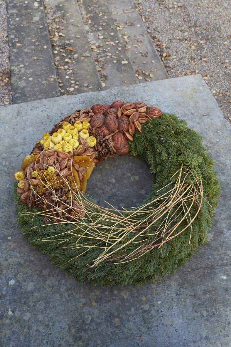 Gedenkfloristik mit dauerhaften Werkstoffen wie Trockenfloralien, Zapfen, Zweigen und Koniferengrün vermag die tief empfundene Liebe und Verbundenheit auch über den trennenden Tod hinaus darzustellen. Für diese florale Fichtenkranzidee sind besonders form- und farbinteressante Trockenfloralien in die Kranzoberfläche eingearbeitet.