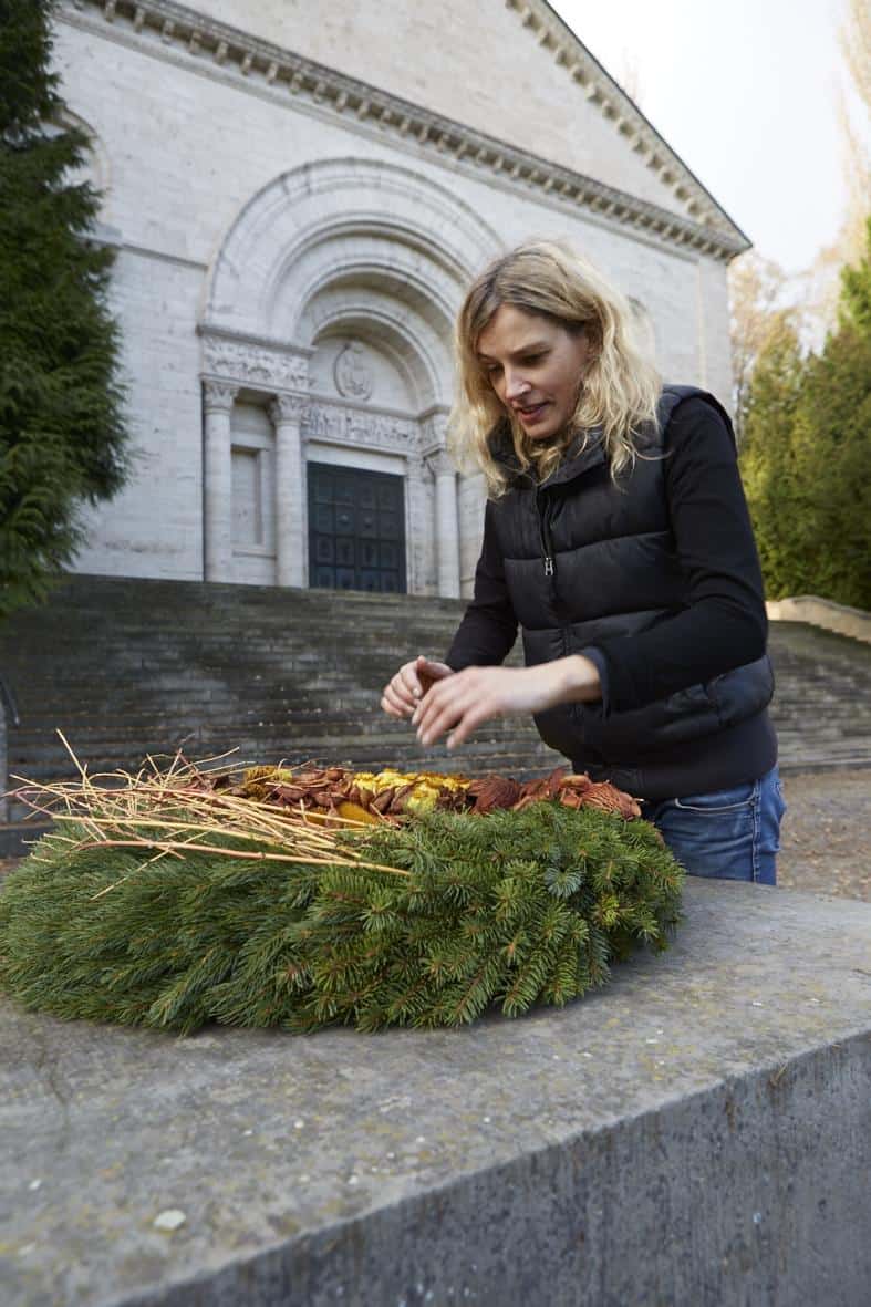 Das so gestaltete Kreisdrittel bildet das visuelle Zentrum dieser Gedenkfloristik. Ein weiteres Drittel des Kranzes ist mit Zweigen in Bewegungsrichtung der Fichtenzweige besteckt.